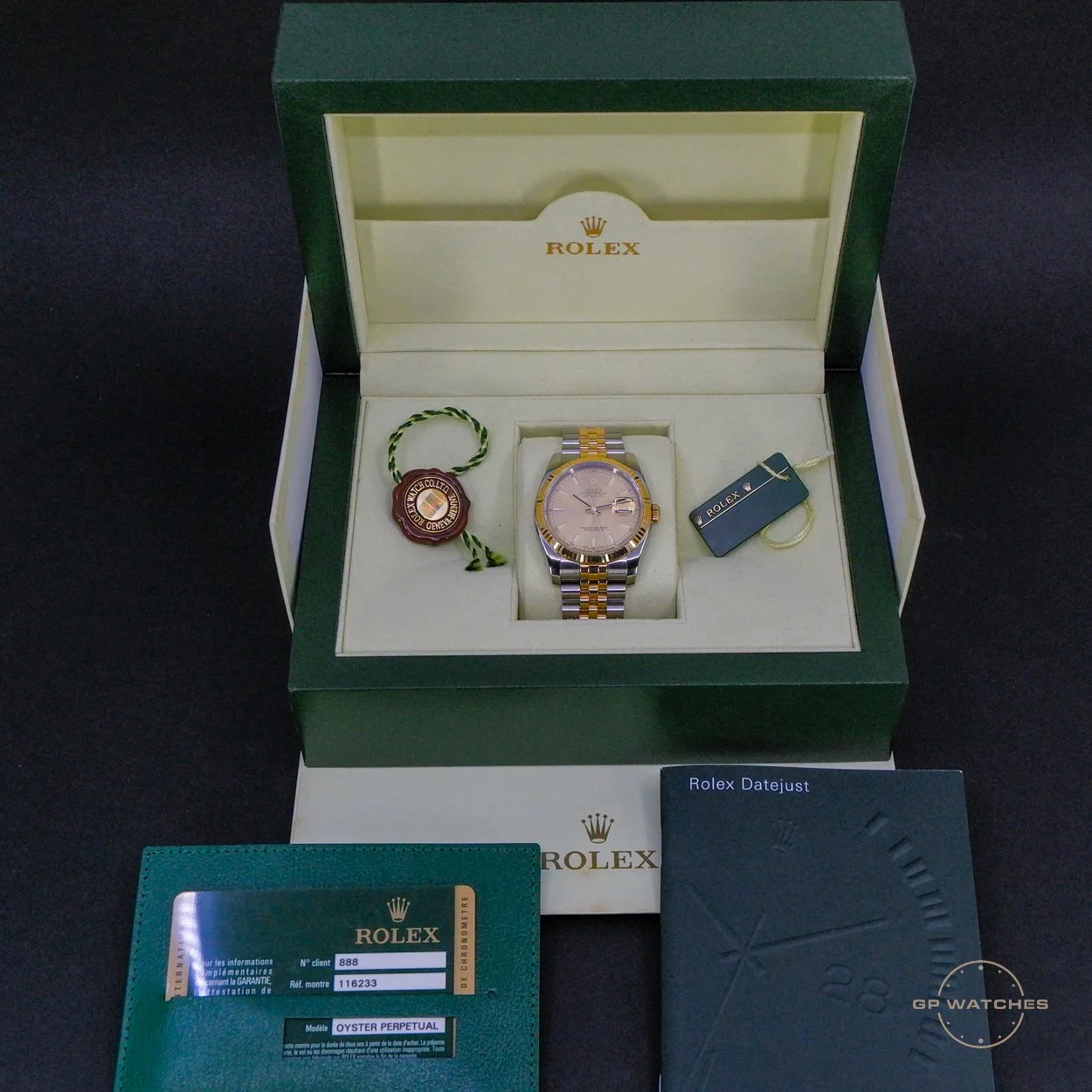 Rolex Datejust 116233. Det populære datejust i guldstål 36 mm med den skjulte lås. Denne model er med den smukke champagneskive med sorte visere. Uret fremstår i god stand og kommer med boks og papirer fra 2015.