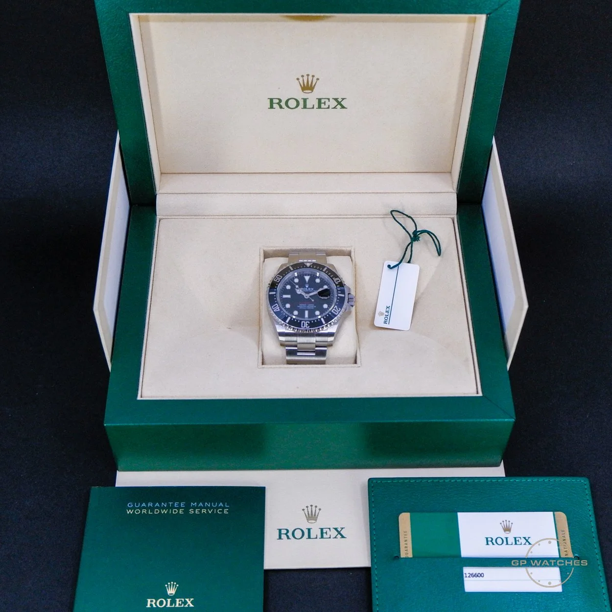 Rolex Sea-Dweller 126600 fra 2019. Dette er den opdaterede Sea-Dweller med 43 mm kasse, rødt modelnavn og det robuste Caliber 3235 værk. Uret har den eftertragtede MK2-skive. Et professionelt dykkerur med imponerende 1.220 meters vandtæthed, som også fungerer perfekt til hverdagsbrug. Fremstår i flot stand med lette brugsspor og leveres med boks og papirer fra 2019.