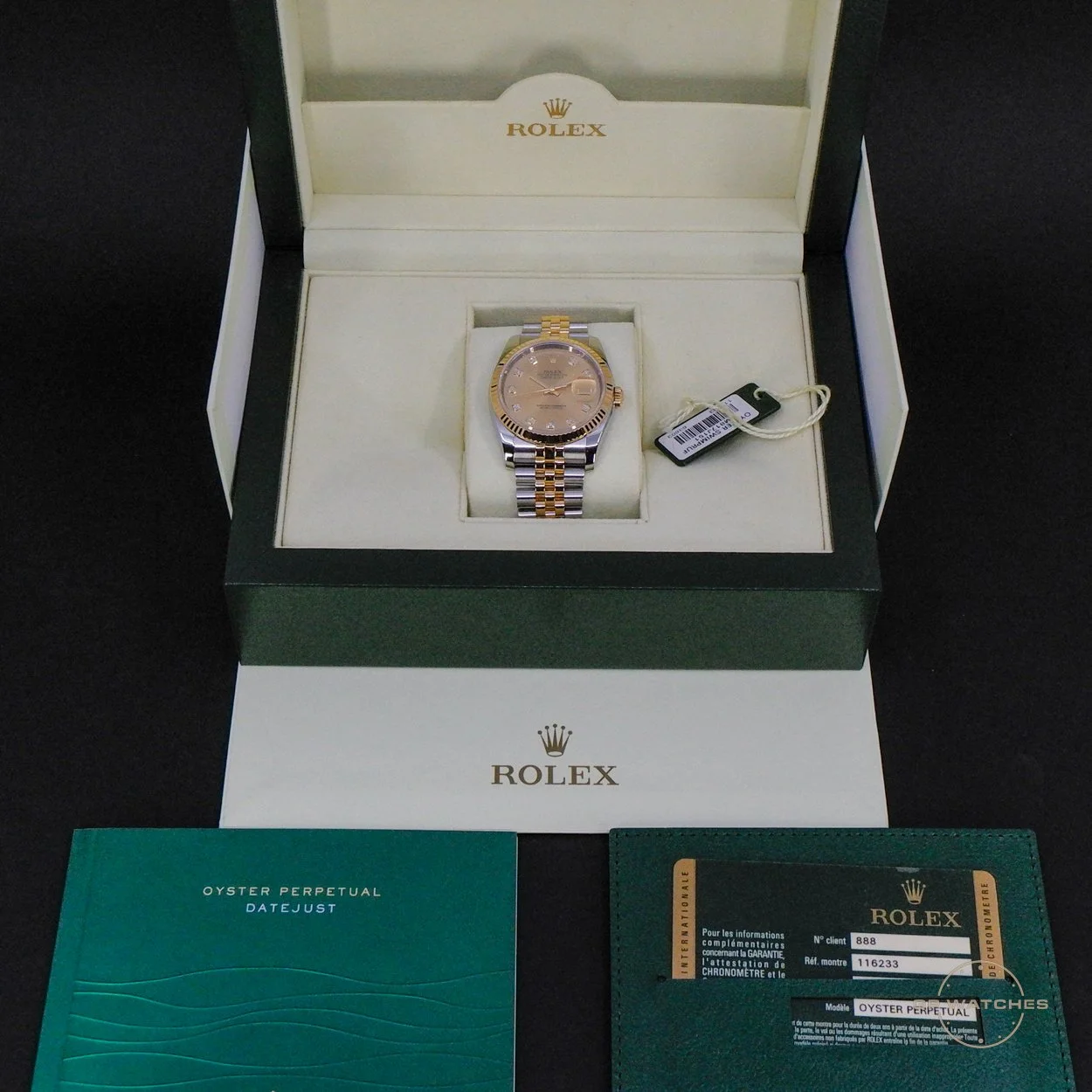 Rolex Datejust 116233. Det populære datejust i guldstål 36 mm med den skjulte lås. Denne model er med den smukke champagneskive med diamanter. Uret fremstår i flot stand og kommer med boks og papirer fra 2013.
