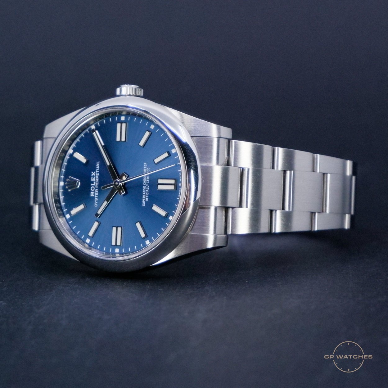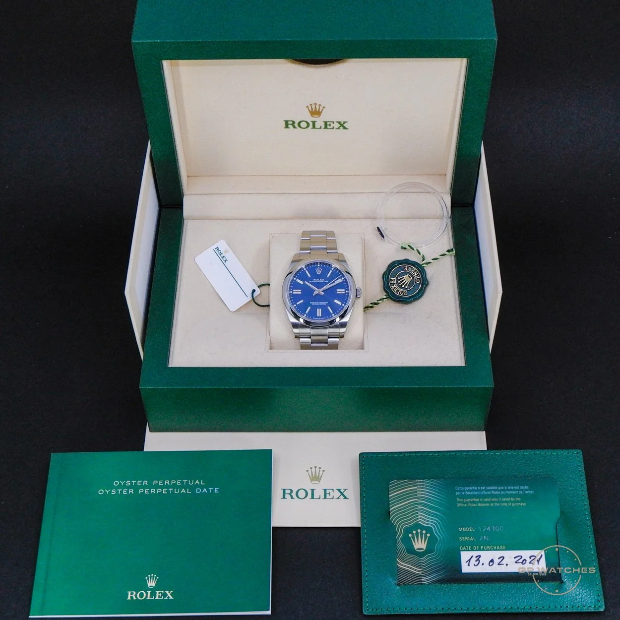 Rolex Oyster Perpetual 41 ref. 124300 med blå skive. Uret er fra 2021 og fremstår i rigtig flot stand. Et perfekt hverdagsur med automatikværk og 100 meter vandtæthed. Leveres med boks og papirer fra slut 2021. Der er Worldwide garanti indtil start 2026.