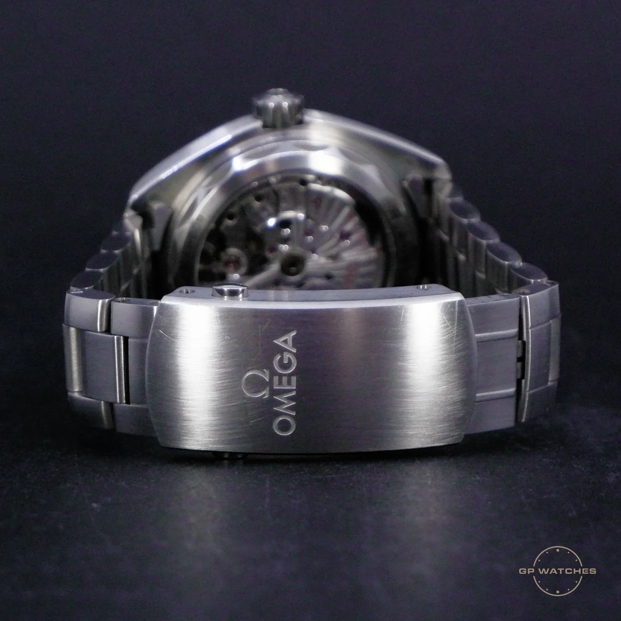 Omega Seamaster Planet Ocean 43,5 mm. Mellem størrelsen af planet ocean som har rigtig fine proportioner. Her i den blå udgave med blå bezel og skive. Fremstår i rigtig flot stand og kommer med boks, papirer og certifikat fra 2020