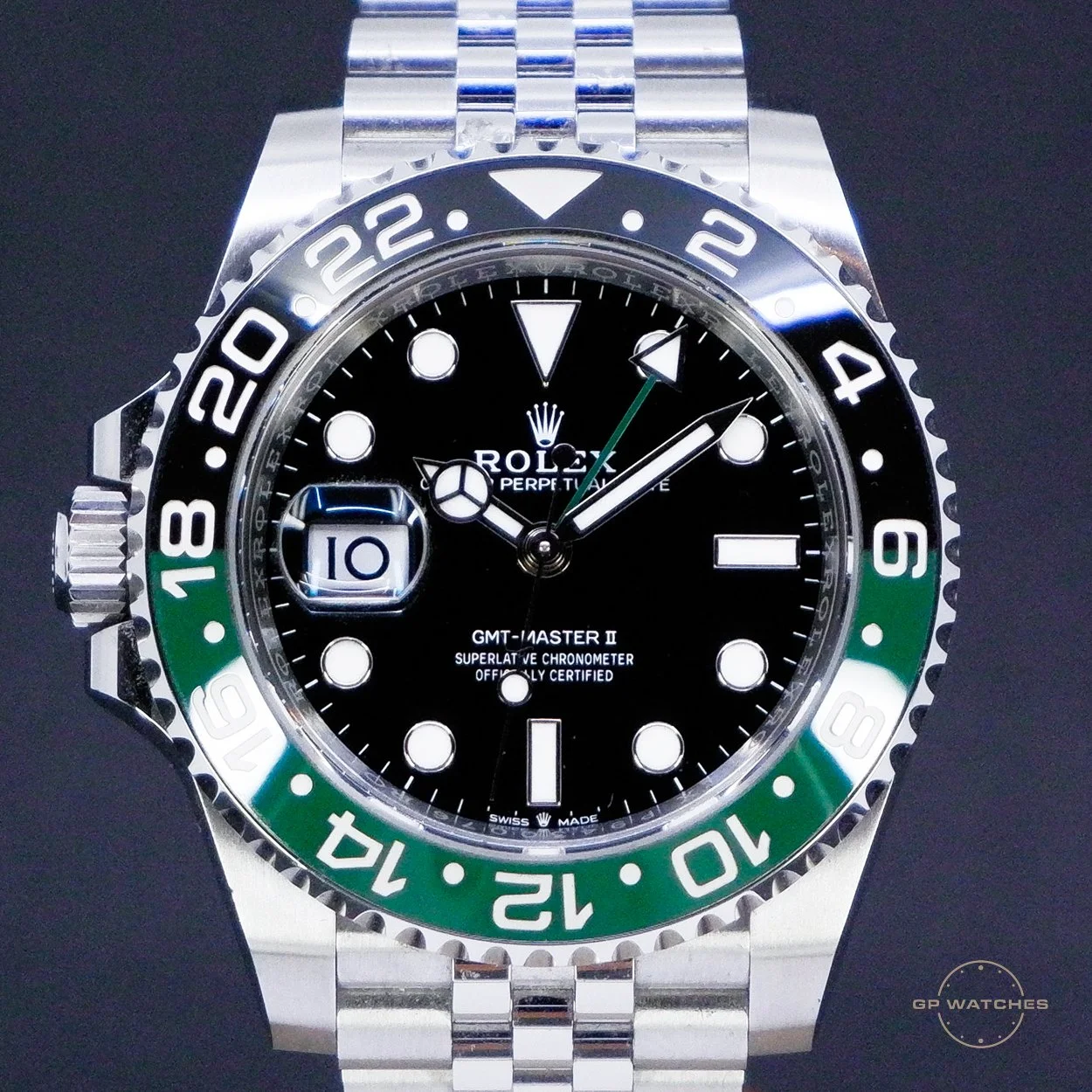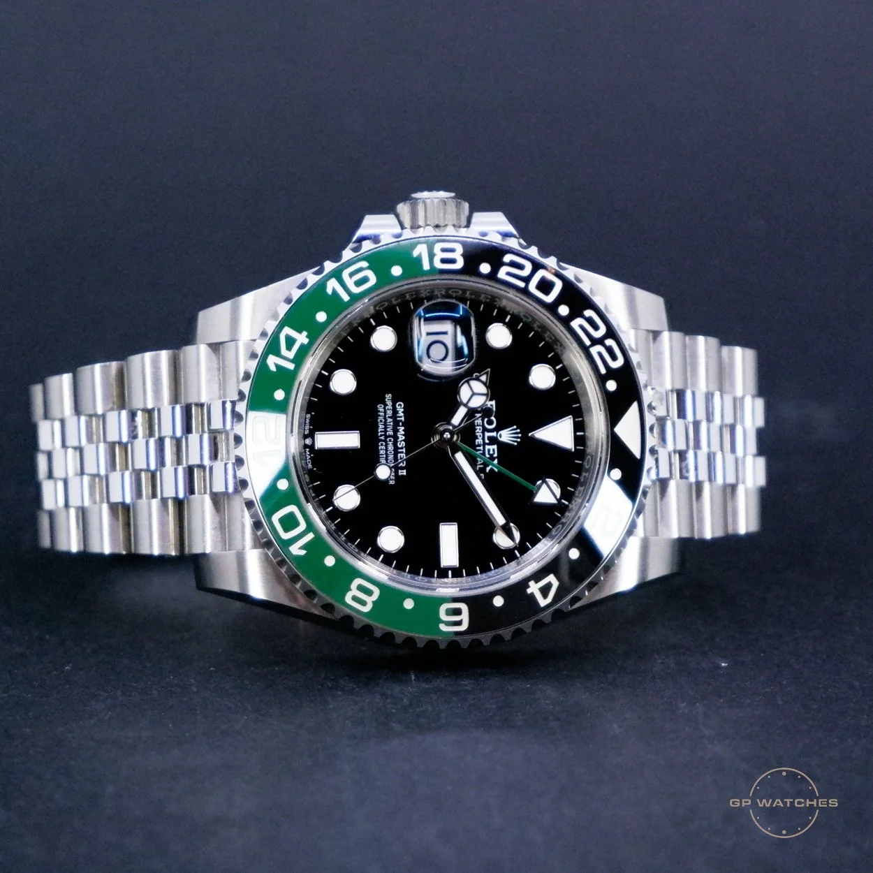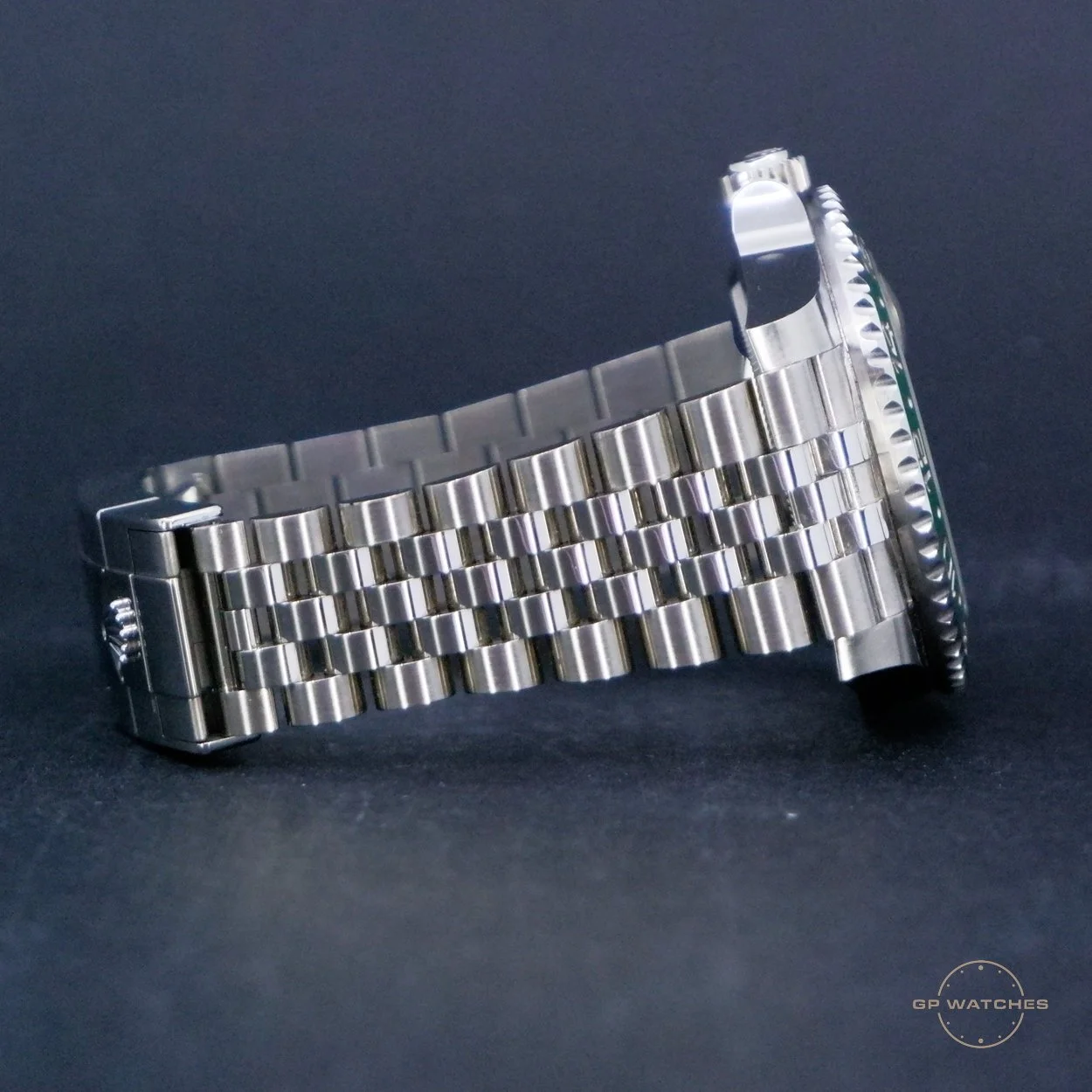 Rolex GMT-Master II 126720VTNR 2025 jubilee. Den aktuelle udgave af den eftertragtede grønne/sorte Gmt-Master II “Sprite” med det nyeste urværk og opdateringer. Uret fremstår i næsten ny stand og kommer som et fuldt sæt med boks og papirer fra januar 2025. Der er worldwide garanti på uret indtil 2030. Den absolut billigste i Europa