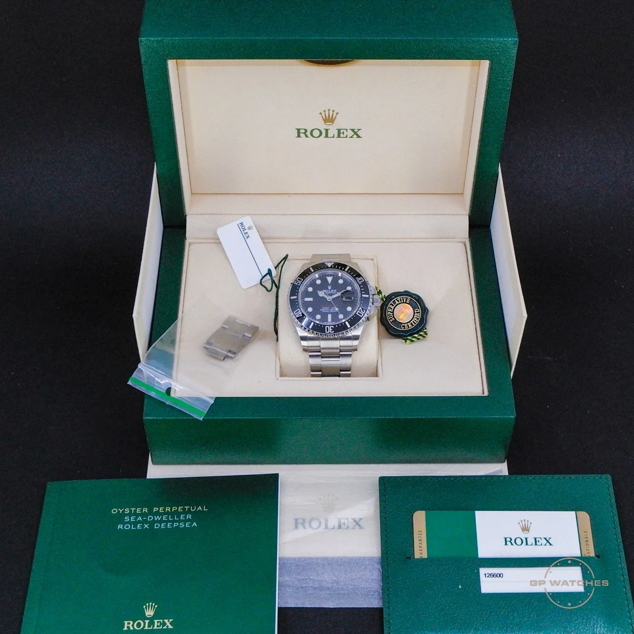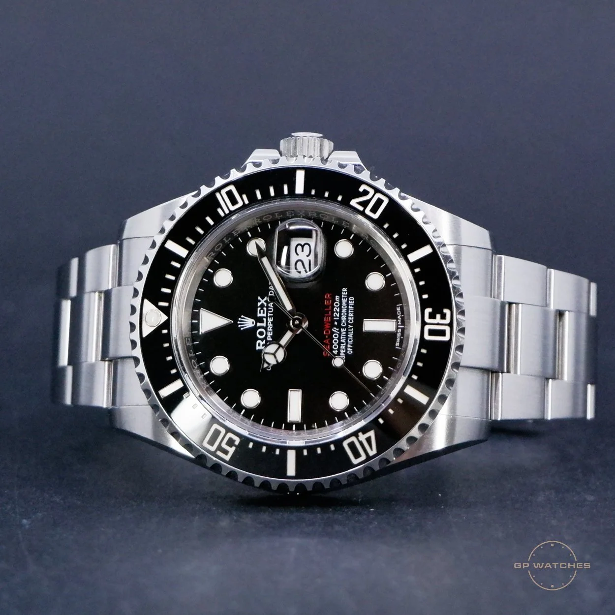 Rolex Sea-Dweller 126600 fra 2018. Uret fremstår i rigtig god stand. Dette er den første og lidt mere sjælden version med mk1 skive. Uret kommer med boks og papirer. Et godt bud på et investeringsur, da de kun er produceret med den skive i 2017-2018.