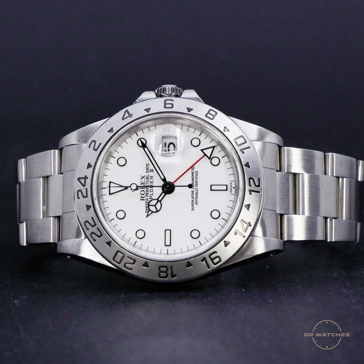 Rolex Explorer II 40 mm. Et rigtig flot eksemplar fra 1998 med matchende originale dele. Det er en af de første udgaver med swiss only skiven. Der medfølger boks og papirer og derudover er uret i rigtig god stand.