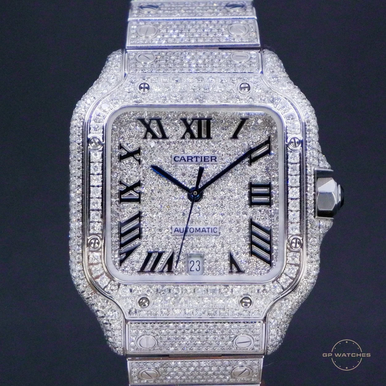Cartier Santos Large. Den aktuelle Cartier santos i Large størrelsen. Helt ubrugt og fabriksnyt. Der medfølger boks og papirer fra 2024 og worldwide garanti fra Cartier indtil 2032. Uret har fået eftermonteret sten overalt på lænke og kasse.