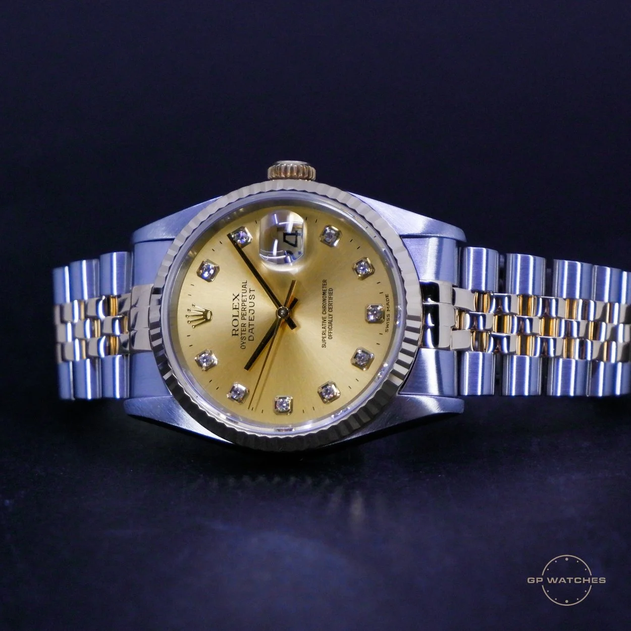 Rolex Datejust 16233 i 36 mm. En af de bedst sælgende datejust hos os. her i den helt rigtige udgave med den nye smukke champagneskive med store diamanter. Uret er i god stand og kommer med boks og papirer fra 1996.