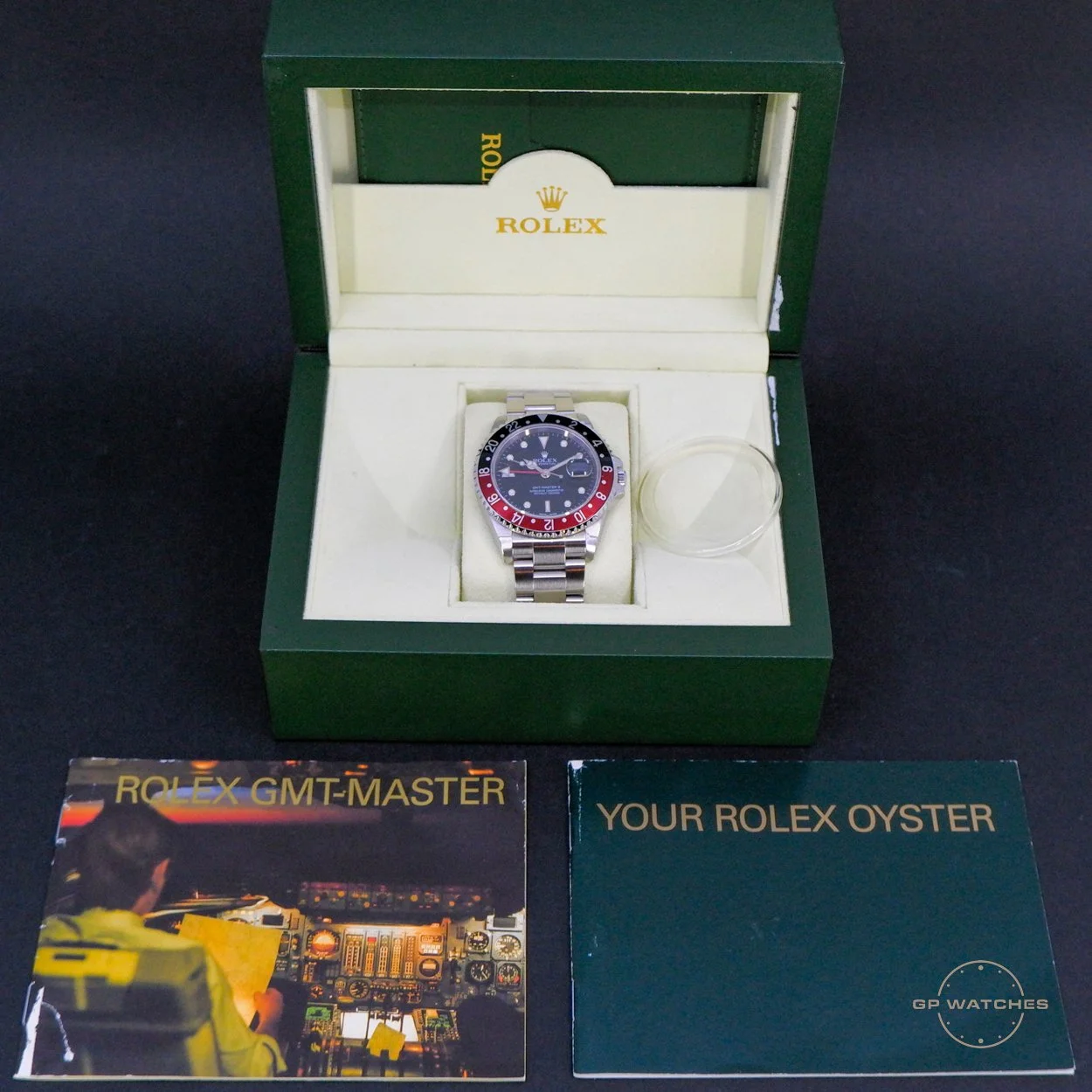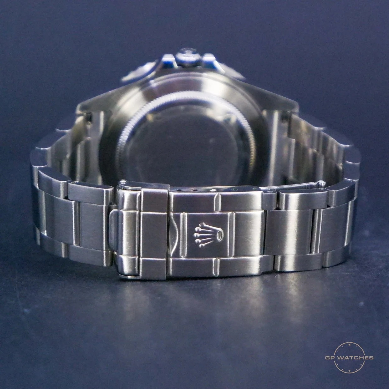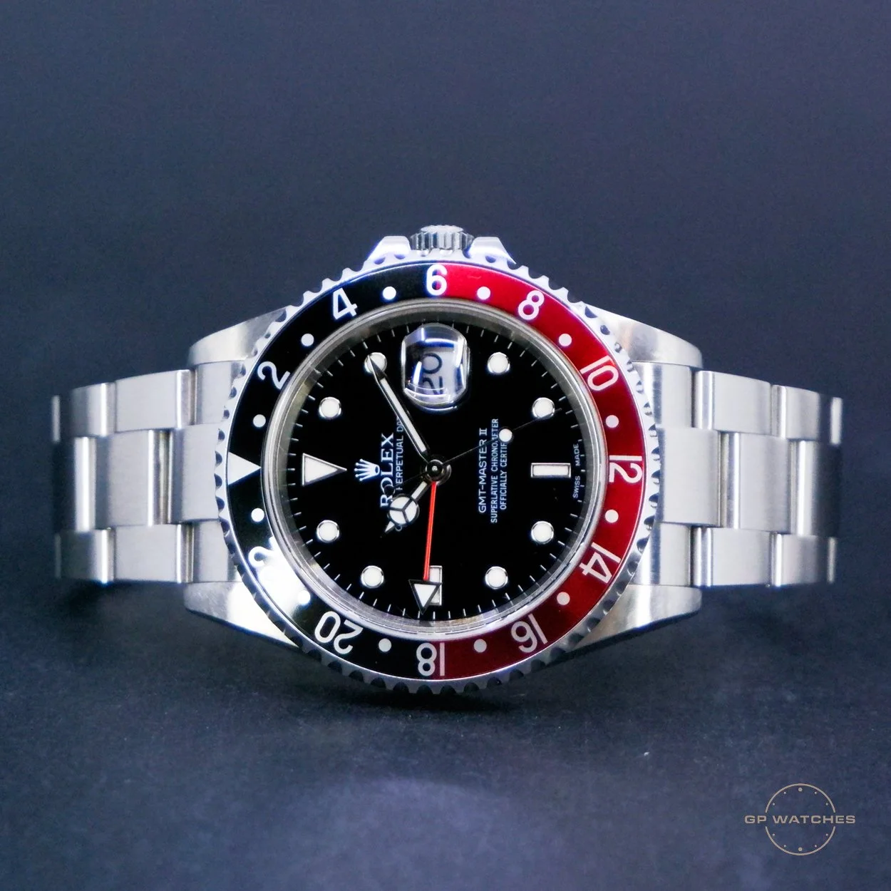 Rolex GMT-Master II 40 mm. Den klassiske og udgåede model af GMT-Master II. Uret fremstår i rigtig god stand. Den nyere udgave med “swiss made” skiven, SEL (solid endlinks) og uden lugholes. Uret leveres med boks og andet tilbehør, men ikke certifikat.