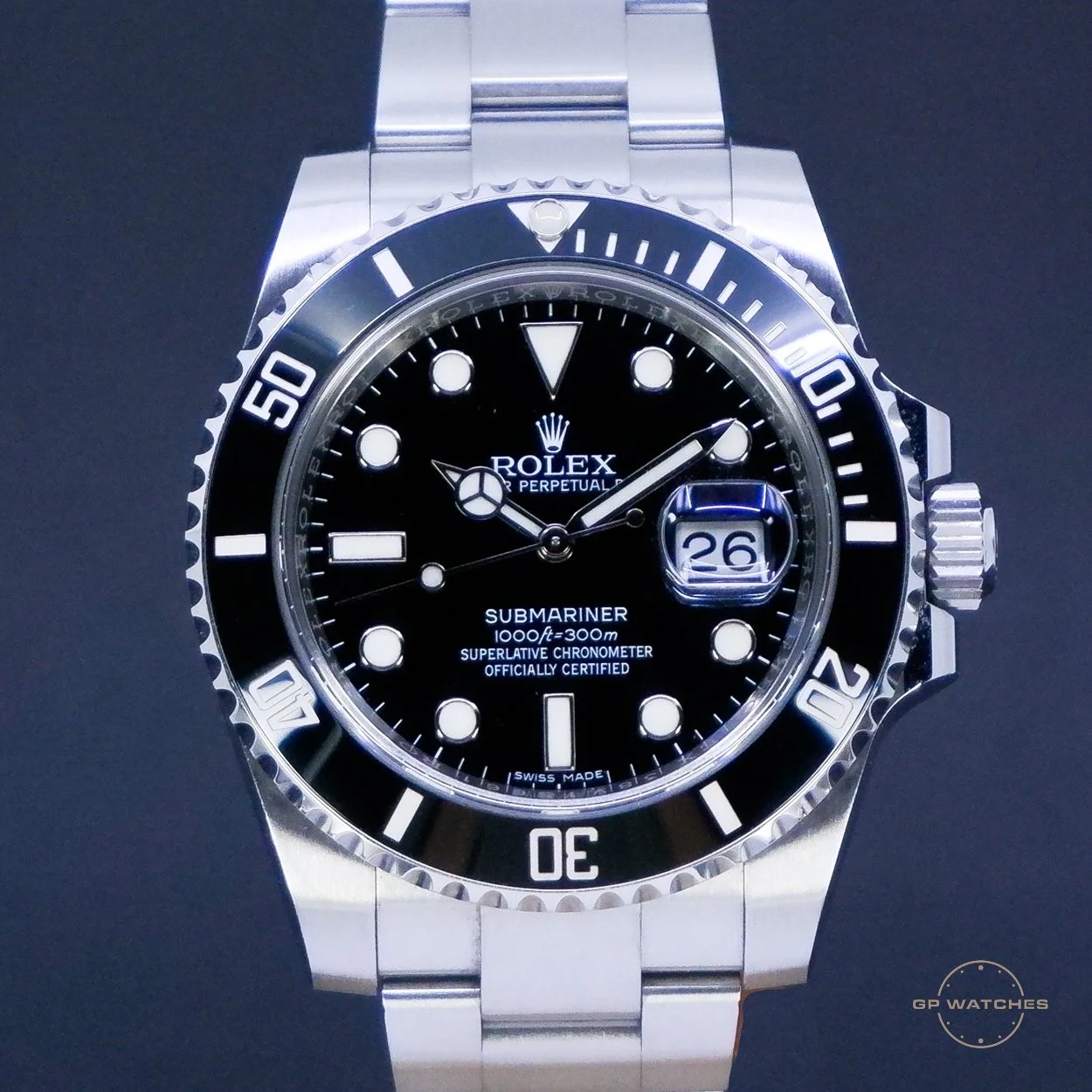 Rolex Submariner 116610LN. Den ældre reference med maxikasse og i 40 mm, modsat den nyere reference 126610 som er 41 mm. Uret fremstår i næsten ny stand. og kommer med yderboks, inderboks, booklets, hangtags og certifikat fra 2017.