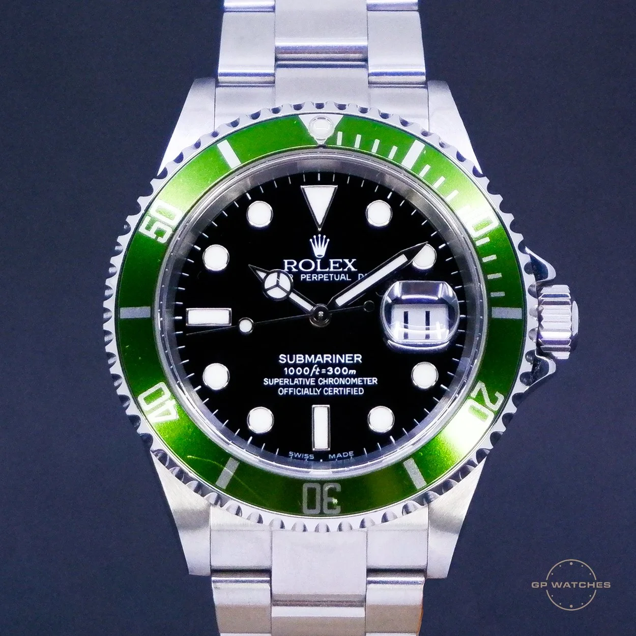 Rolex Submariner 16610LV. Den velkendte “Kermit” Her en af de “midterste” udgaver fra 2005. Uret er i super fin stand og kommer med boks og papirer. En legendarisk jubilæumsudgave, som måske kan være en god investering i fremtiden.