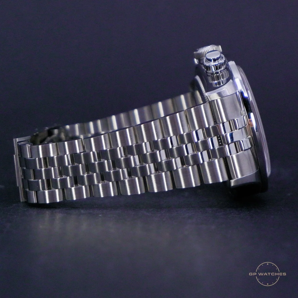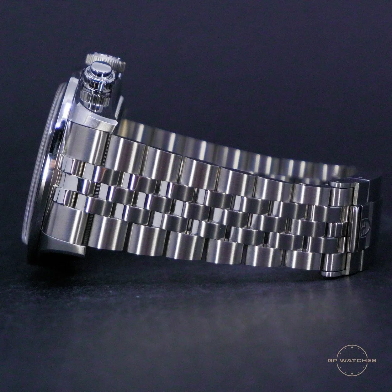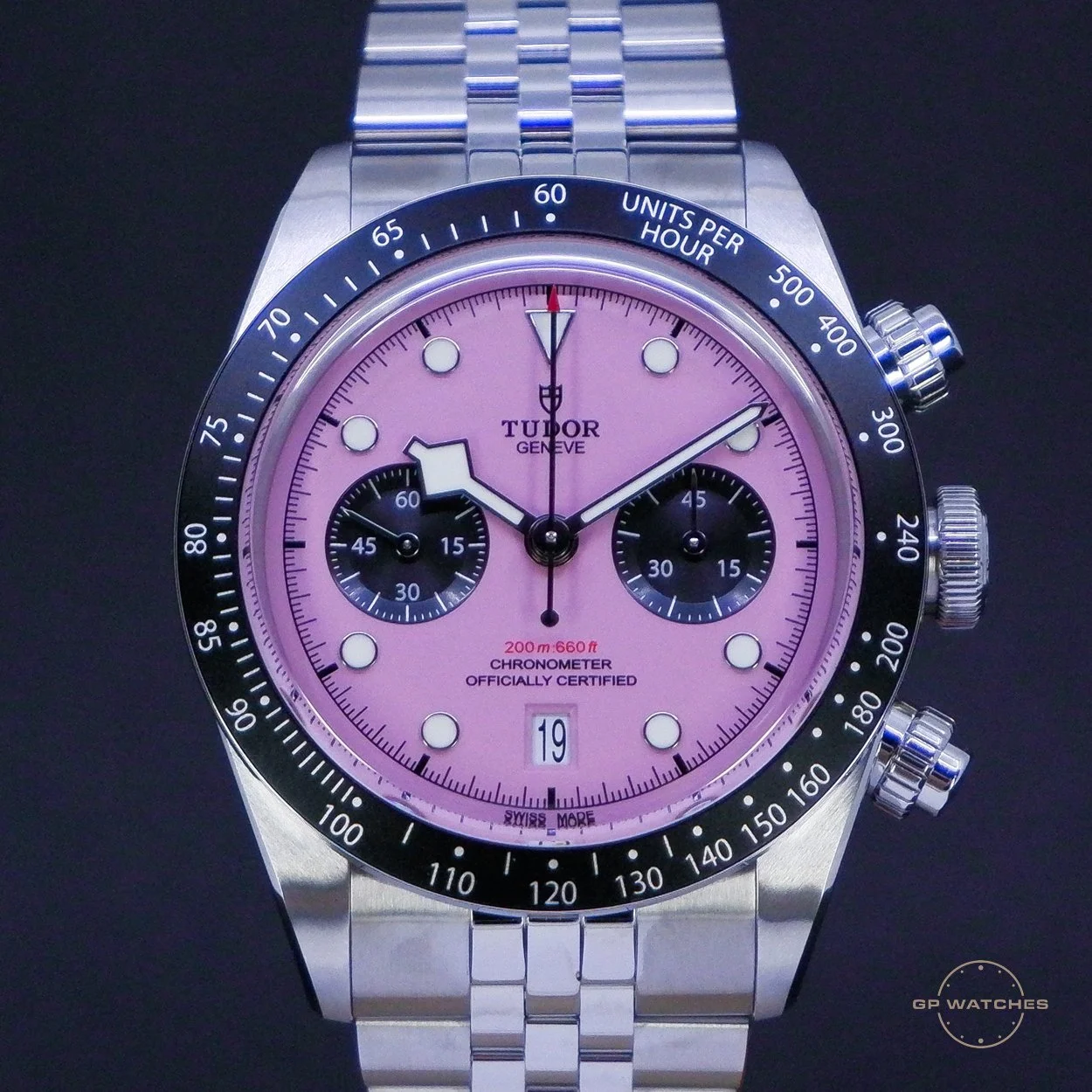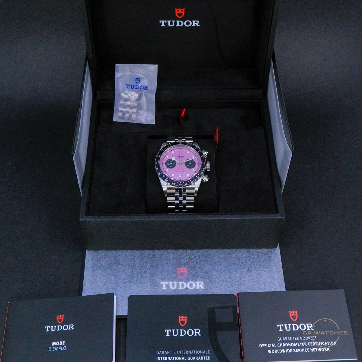 Tudor Black Bay Chrono ref. 79360N med den eftertragtede pink skive. Et sporty og elegant chronograph-ur med klare referencer til Tudors racing-DNA. Uret er i flot stand og kommer med boks og papirer fra 2025. Der er fabriksgaranti fra Tudor indtil 2030. et af de eneste Tudor med lange ventelister ved AD.