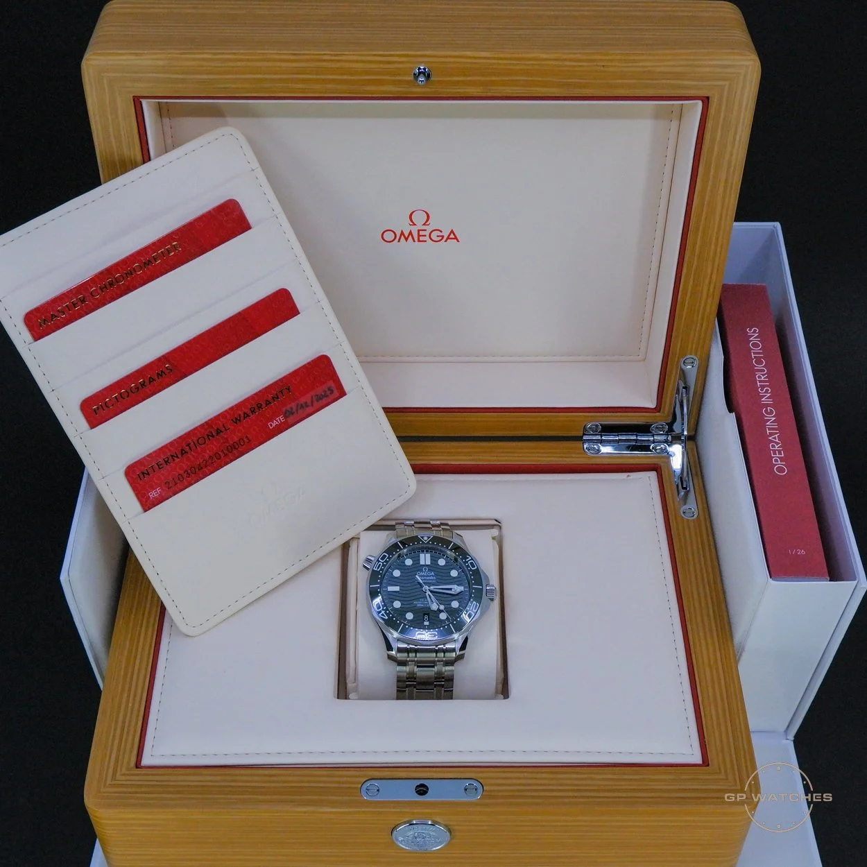 Omega Seamaster Diver 300M 42 MM. Den aktuelle model fra Omega med den flotte grønne skive og bezel. Uret er fabriksnyt og kommer med boks og papirer fra december 2025. Den aktuelle listepris er 50.600 kr. Så her er muligheden for at få et helt nyt ur til en rigtig skarp pris. Der er 5 års worldwide garanti indtil 2030.