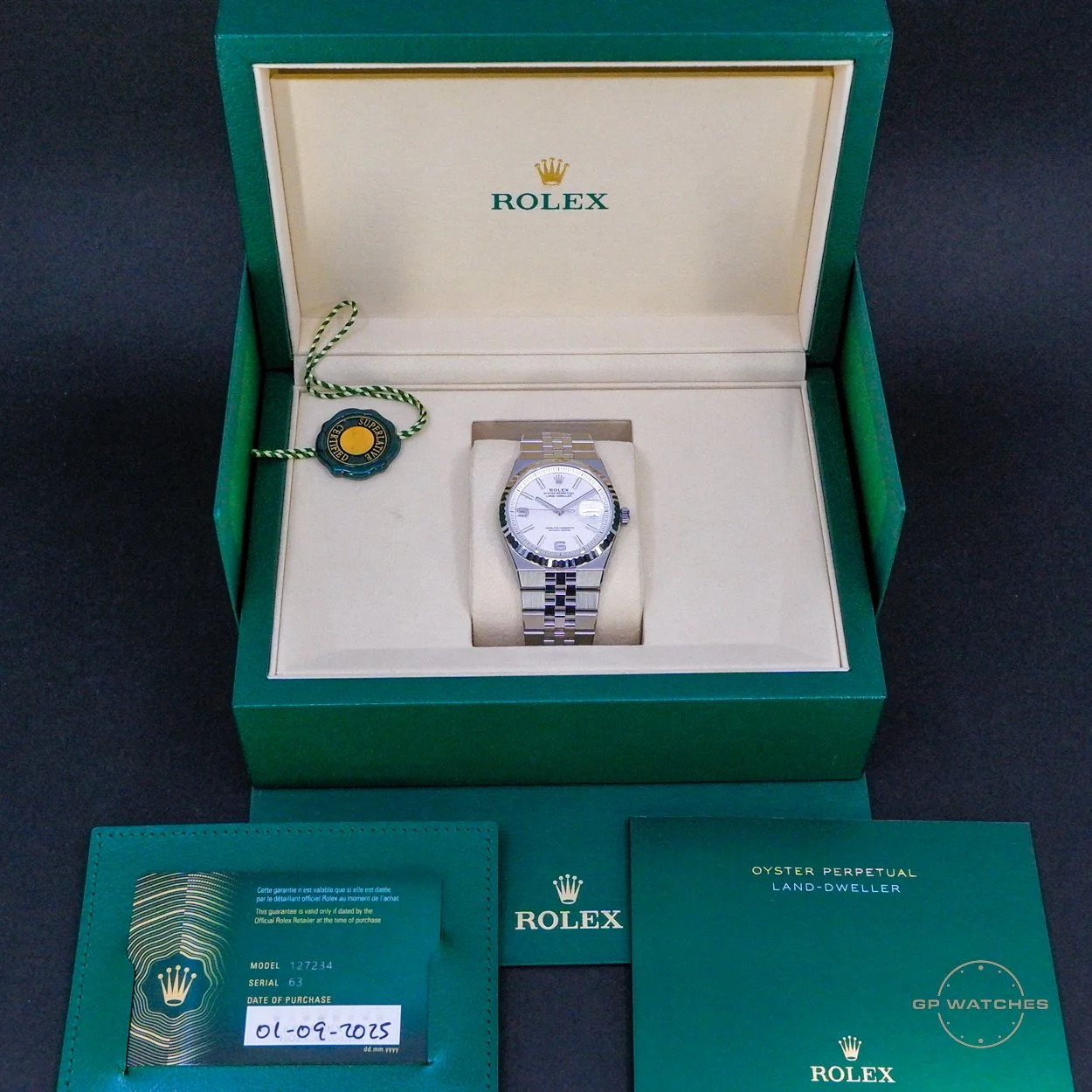 Uret er fra 2025, helt nyt og ubrugt, og leveres som et komplet sæt med boks, certifikat og papirer samt fuld Rolex worldwide garanti.