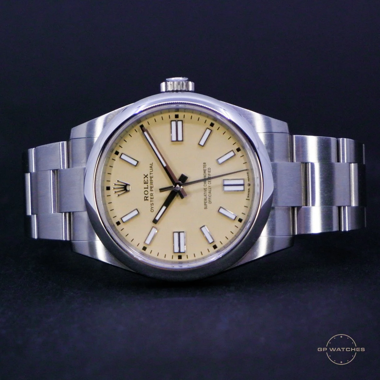 Rolex Oyster Perpetual 41 ref. 134300 med den nye beigefarvet skive. Uret er fra midt 2025 og fremstår i rigtig god stand. Den iøjnefaldende beige skive er blandt de mest eftertragtede farver i OP-serien. Et perfekt hverdagsur med automatikværk og 100 meter vandtæthed. Leveres med den nye grønne boks, papirer og certifikat og 5 års worldwide garanti fra Rolex.