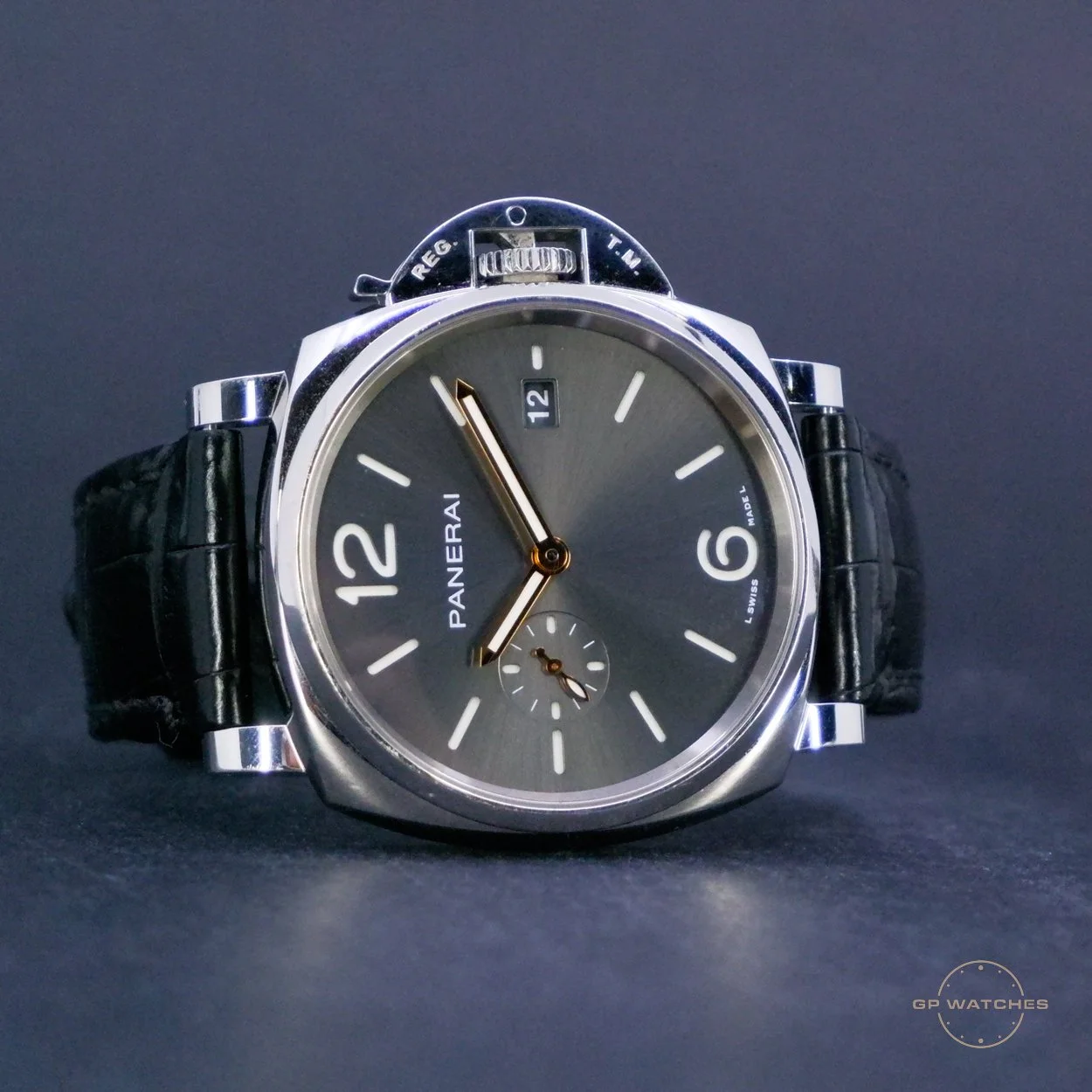 Panerai Luminor Due ref. PAM01250 fra 2022. En mere elegant og slank fortolkning af det klassiske Luminor-design, her udført i 42 mm med den flotte grå skive. Uret fremstår i rigtig flot stand med kun lette brugsspor.