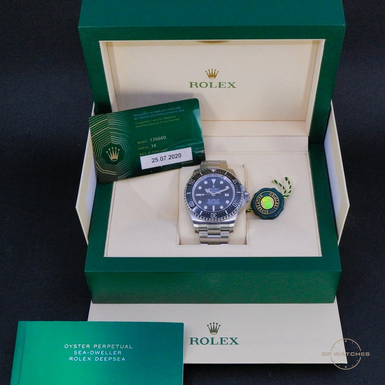 Rolex Sea-Dweller Deepsea 126660. Den legendariske Deepsea i hele 44mm. Uret fremstår i rigtig god stand. Kommer med boks og papirer fra 2020. Bemærk det her er den nyere reference 126660 med opdateret værk og bredere lænke og spænde ift. forgængeren. Her i den seneste version med det grønne certifikat fra juli 2020.