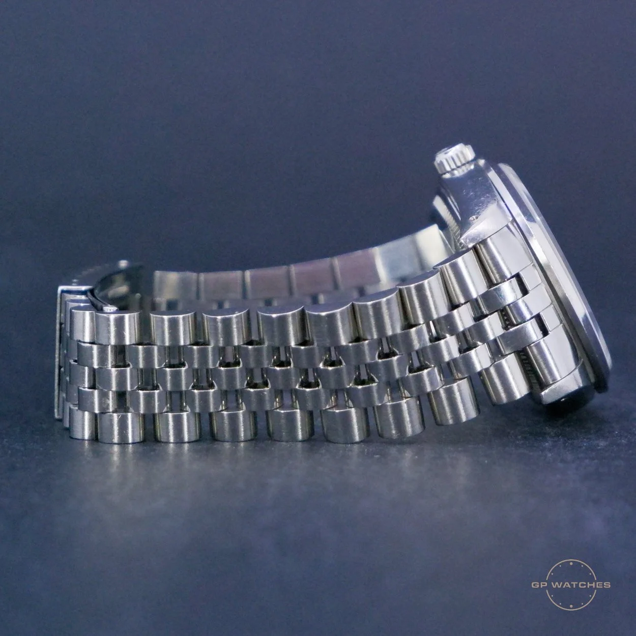 Elegant og klassisk Rolex Aikring ref. 14000 med blank stållynette og den ikoniske jubileelænke. Uret måler 34 mm og fremstår med beige/sølv skive og stålvisere – et tidløst valg til både hverdag og formelle anledninger. Uret kommer med certifikat og diverse verificeringer solgt i 1991. Uret har en tekst på bagkassen, givet i gave som jubilæum i en svensk bank. Dette kan poleres væk, men giver en god historie.