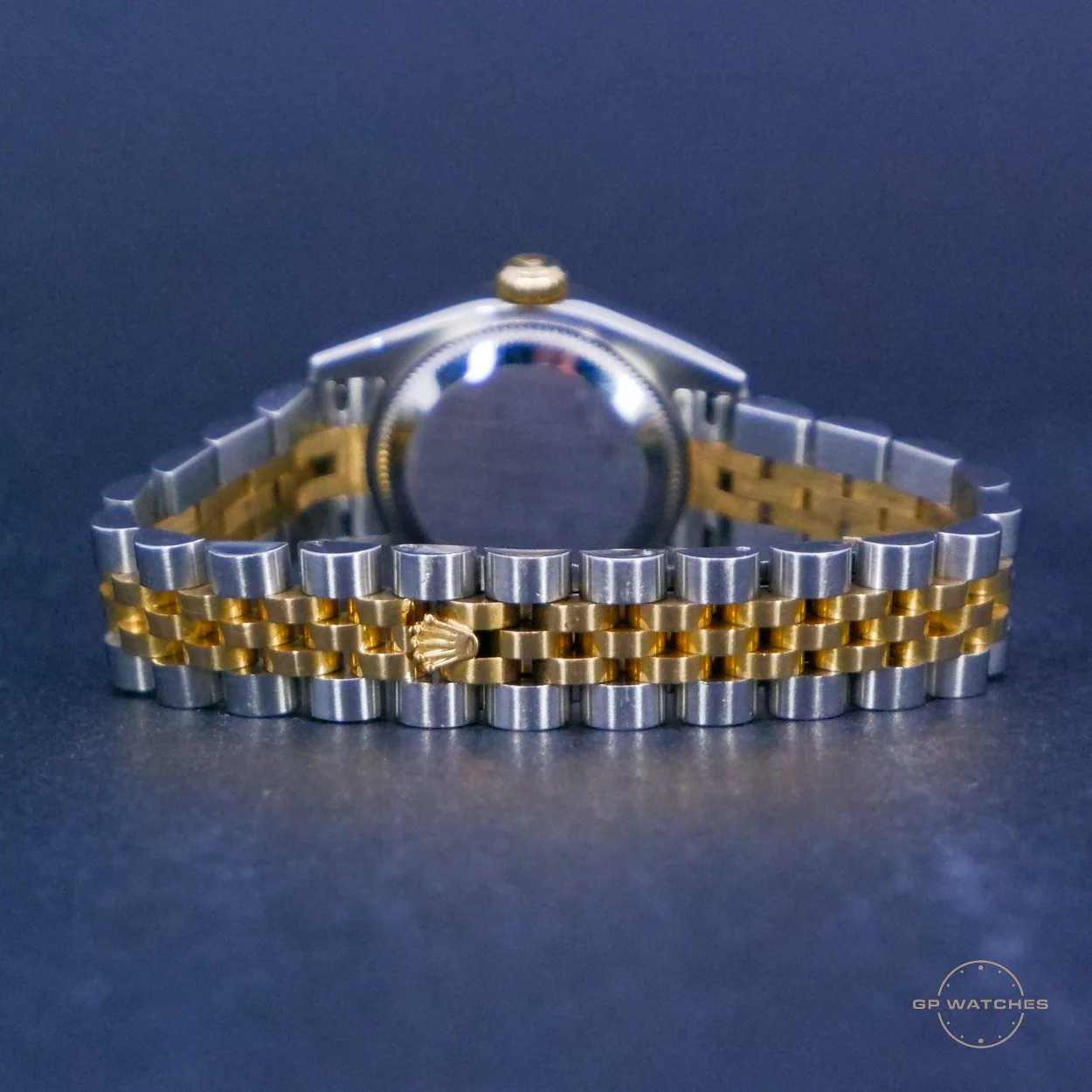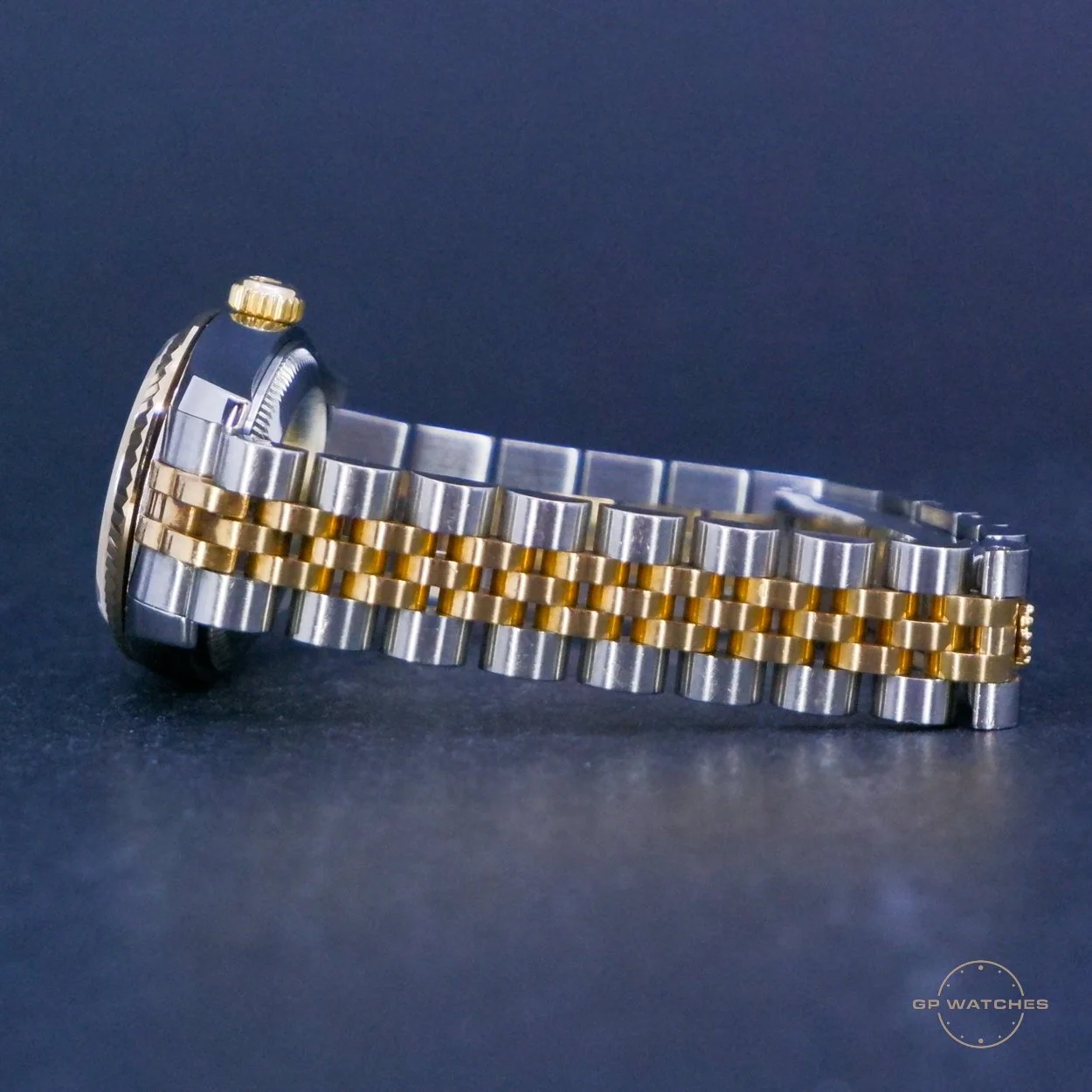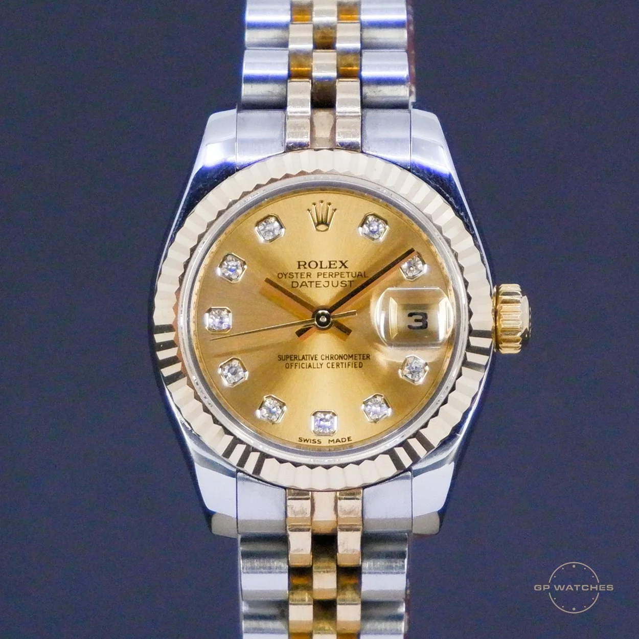 Rolex Datejust 179173 i 26 mm. Et af de mindste, men ikke mindst meget charmerende datejust som Rolex har lavet. En rigtig populær model og især med den smukke champagneskive med diamanter. Dette er den nyere udgave med den populære skjulte lås. Uret er i god stand og kommer med boks og papirer fra 2007. Passer til håndled på op til 16 cm med de led som sidder på.
