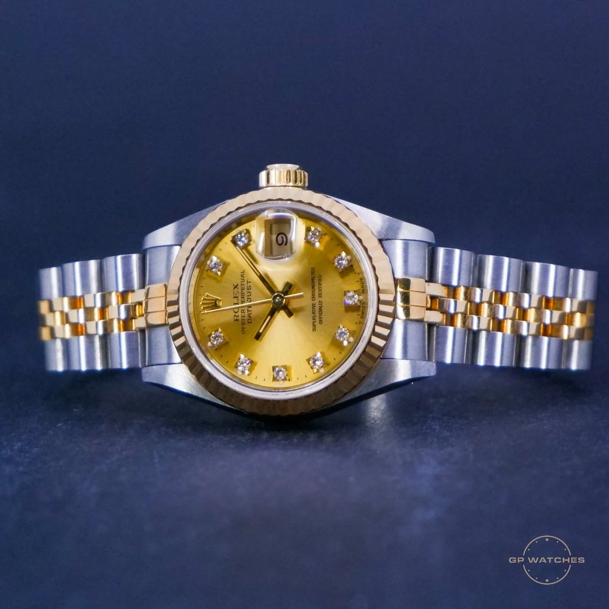 Rolex Datejust 69173 i 26 mm. Et af de mindste, men ikke mindst meget charmerende datejust som Rolex har lavet. En rigtig populær model og især med den smukke champagneskive med diamanter. Uret er i god stand og kommer med boks og papirer fra 1994.