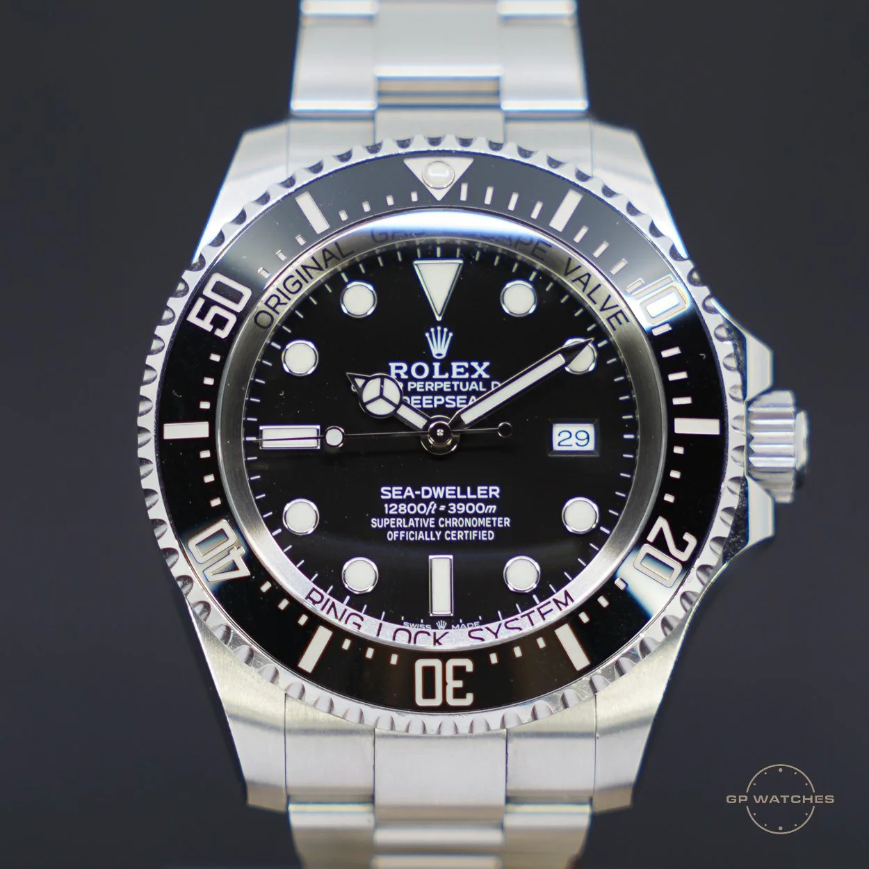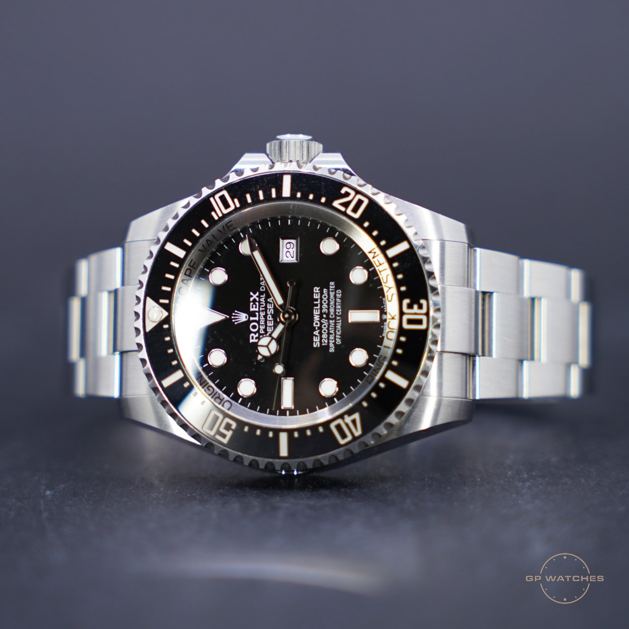 Rolex Sea-Dweller Deepsea 126660. Den legendariske Deepsea i hele 44 mm. Uret fremstår i næsten ny stand kun med et par minimale hairlines. Kommer med boks og papirer fra 2019. Bemærk det her er den nyere reference 126660 med opdateret værk og bredere lænke og spænde ift. forgængeren.