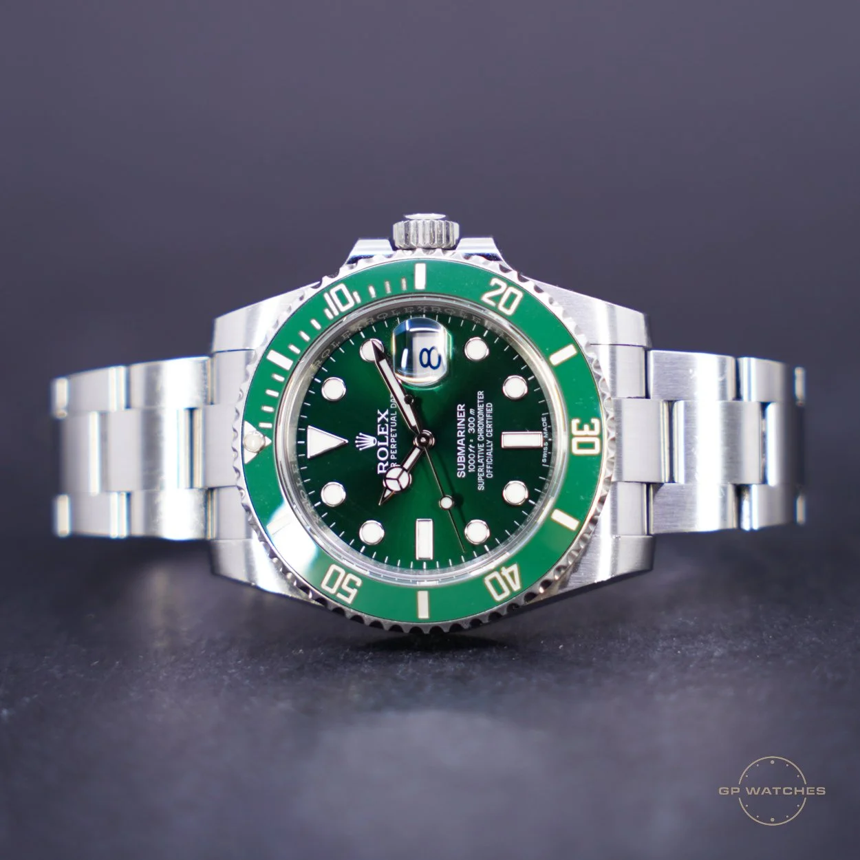 Rolex Submariner 116610LV Hulk 2016. Uret fremstår i god stand med lidt småhairlines, men kunne godt bruge en let polering. Kommer med boks og papirer fra 2016.