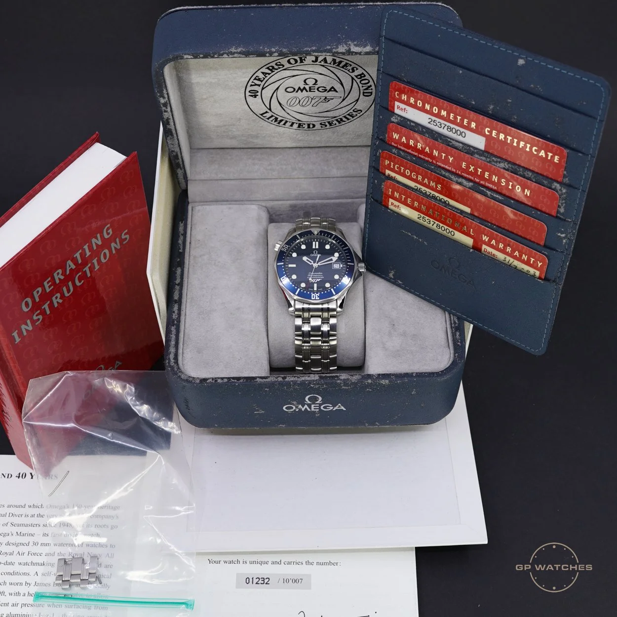 Omega Seamaster Diver 300M 007 edition 41 MM. Et rigtig cool omega seamaster lavet til James bond 40 års jubilæum. Den er limiteret til 10007 stk og dette er nr. 1232. Uret er fra dansk forhandler og kommer som et fuldt sæt. Uret er fuldstændig ubrugt og aldrig gået med. Et sjovt investeringsur til en fair pris.