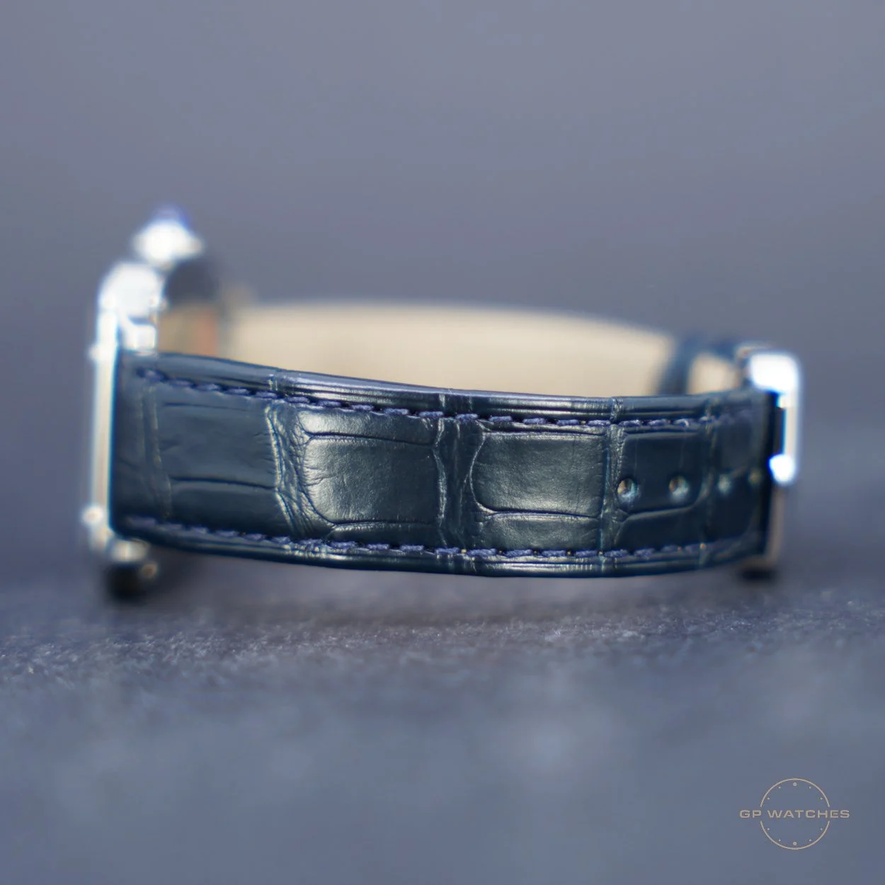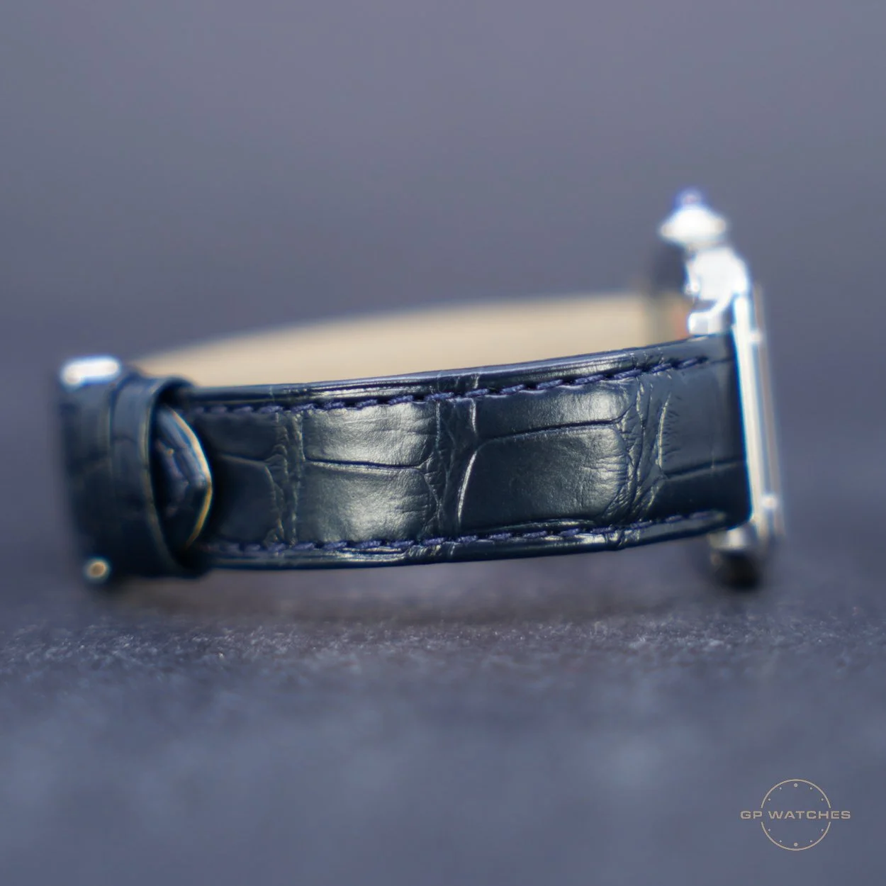 Flot Santos dumont med den flotte originale blå læderrem. Quartz urværk og 8 års garanti. Uret er helt fabriksnyt og kommer med boks og papirer fra december 2025. Nypris ved Carter er 38.600 kr.