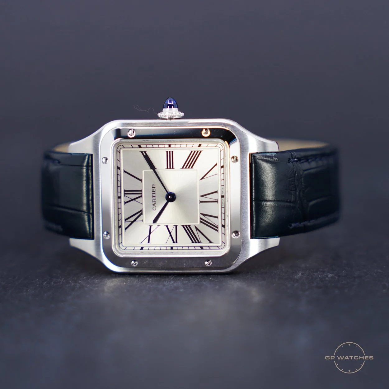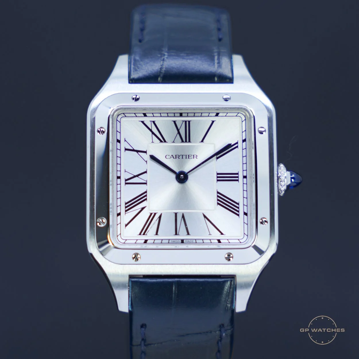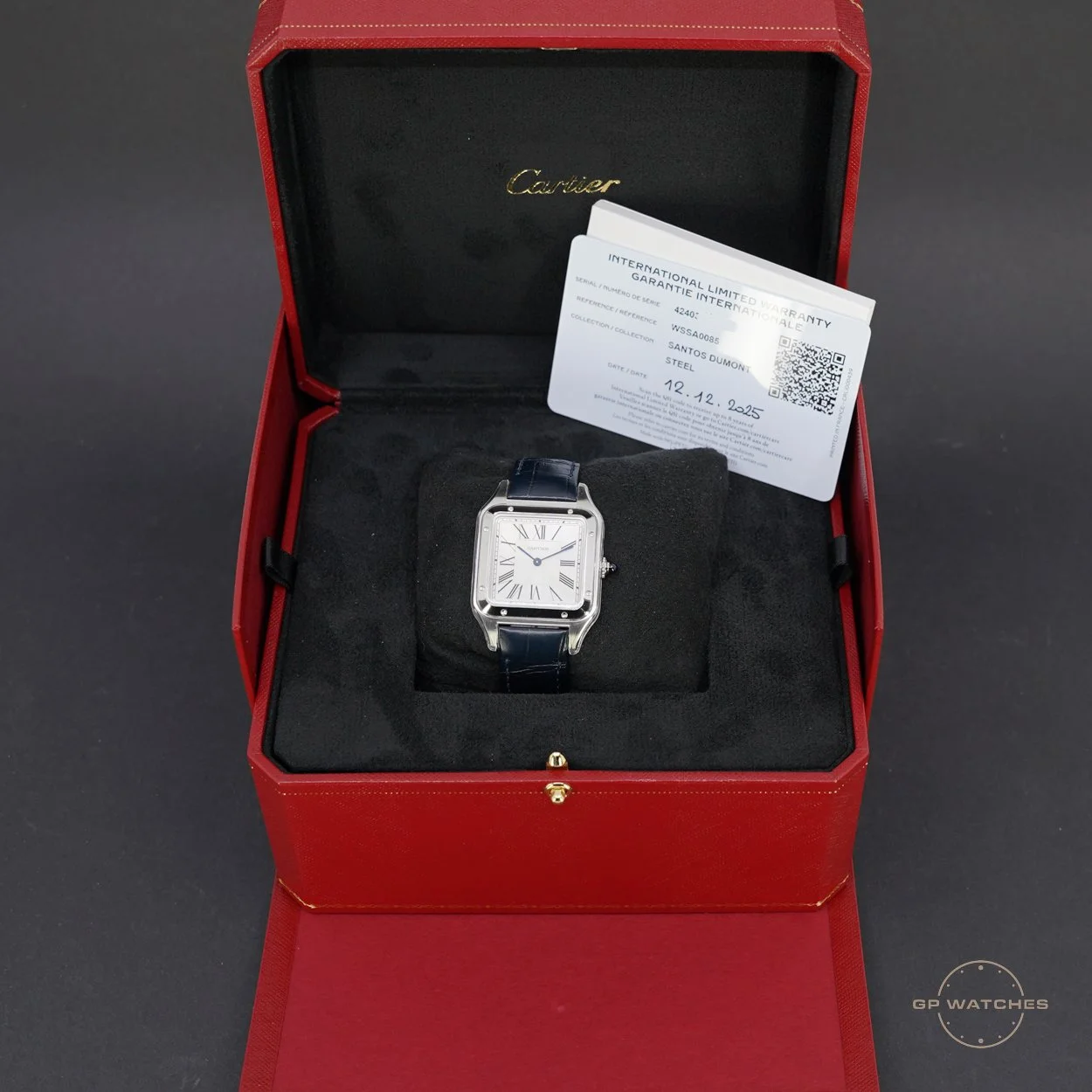 Her udbydes en fin Cartier Santos Dumont, reference WSSA0085 – en moderne fortolkning af et ægte designikon. Modellen kommer i stål med den elegante sølv skive, klassiske romertal og blå visere.