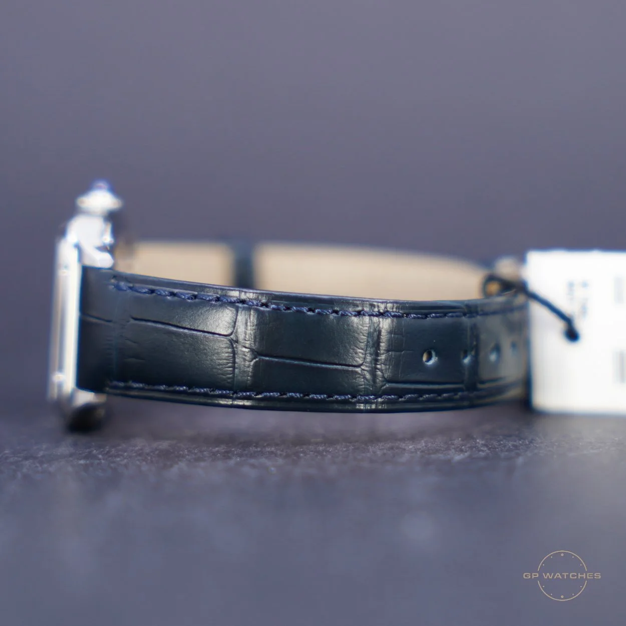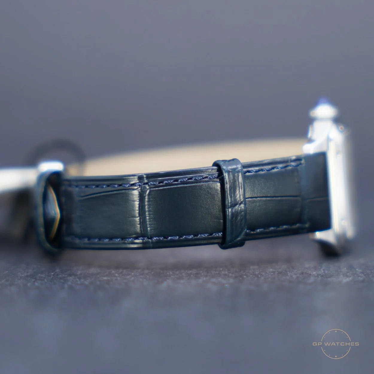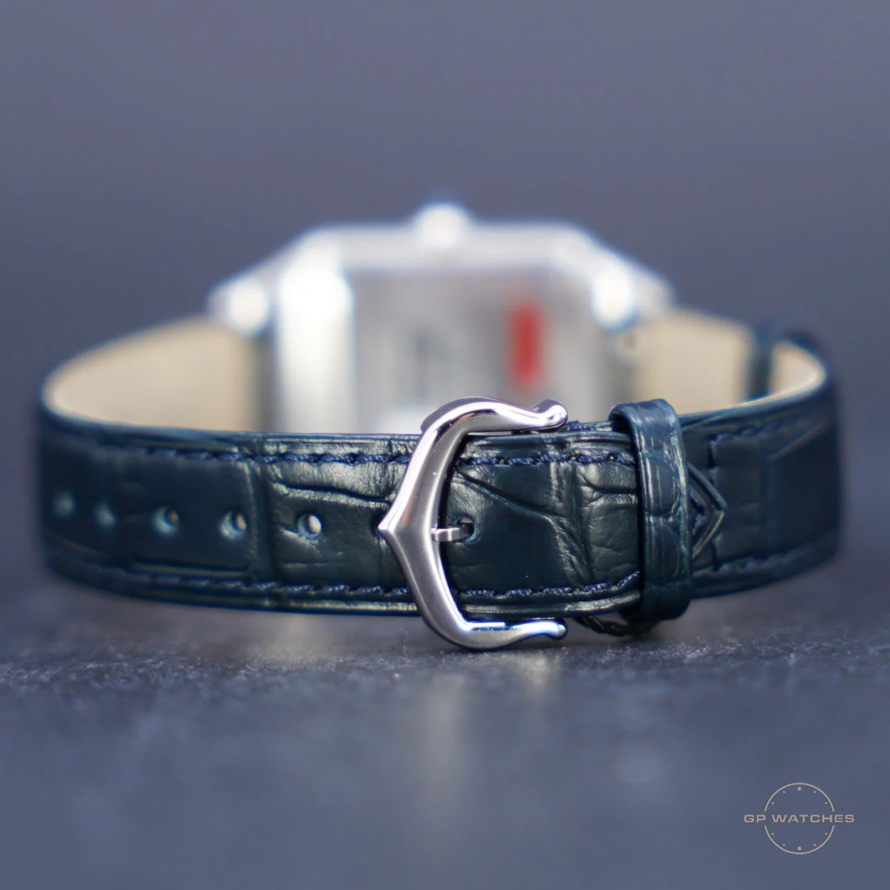 Flot Santos dumont med den flotte originale blå læderrem. Quartz urværk og 8 års garanti. Uret er helt fabriksnyt og kommer med boks og papirer fra 2026. Nypris ved Carter er 36.300 kr.