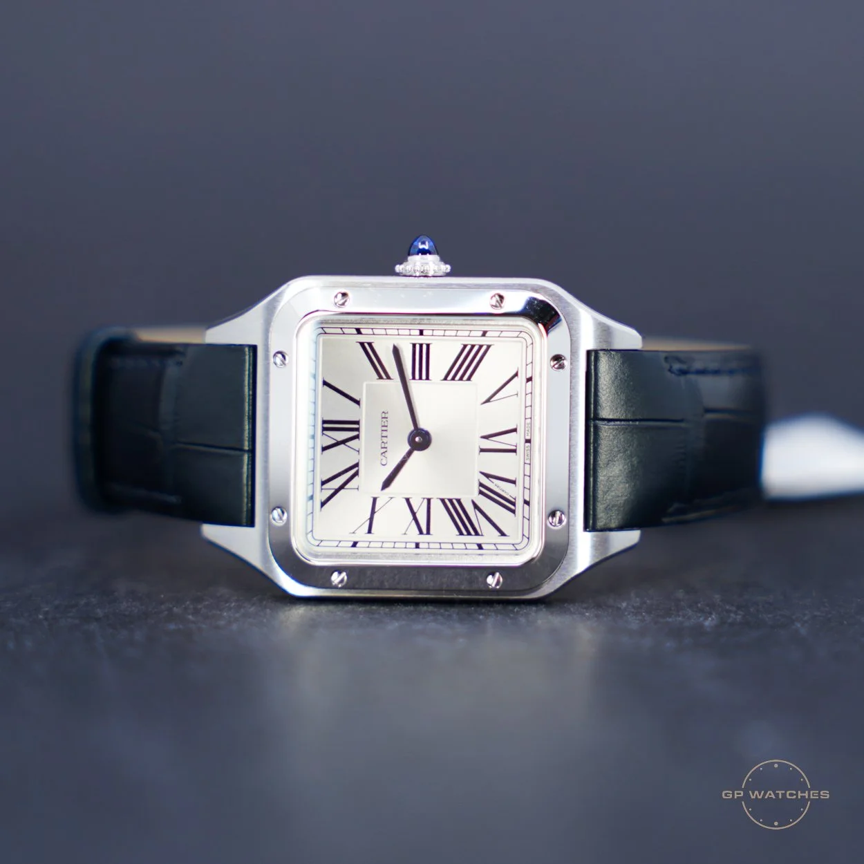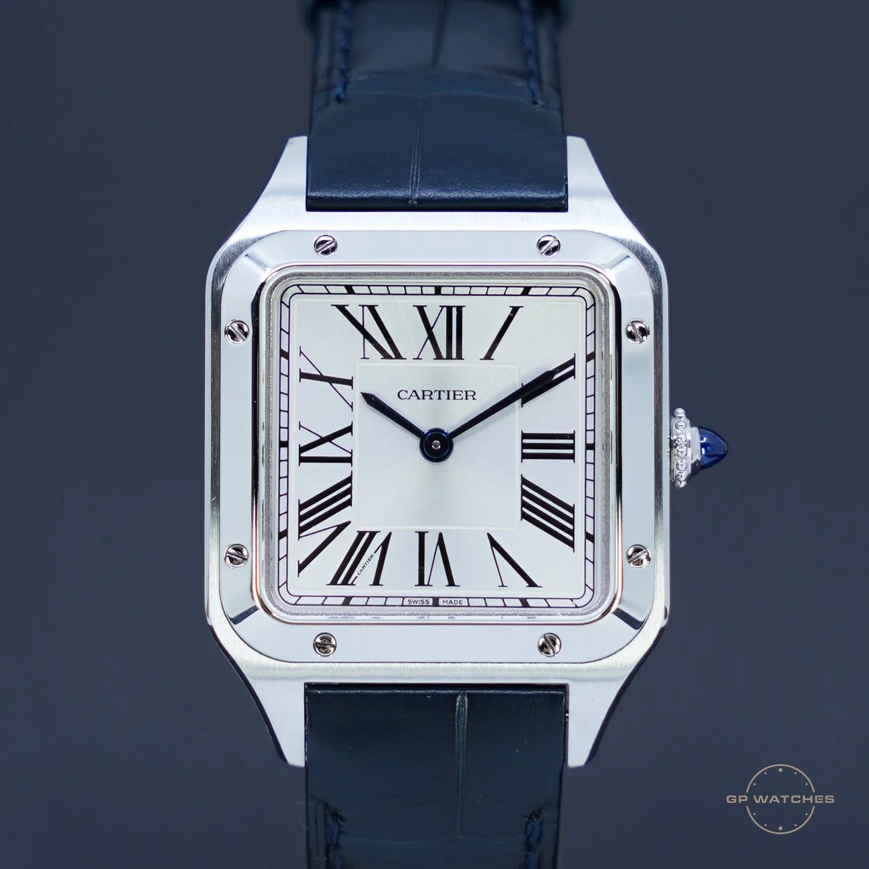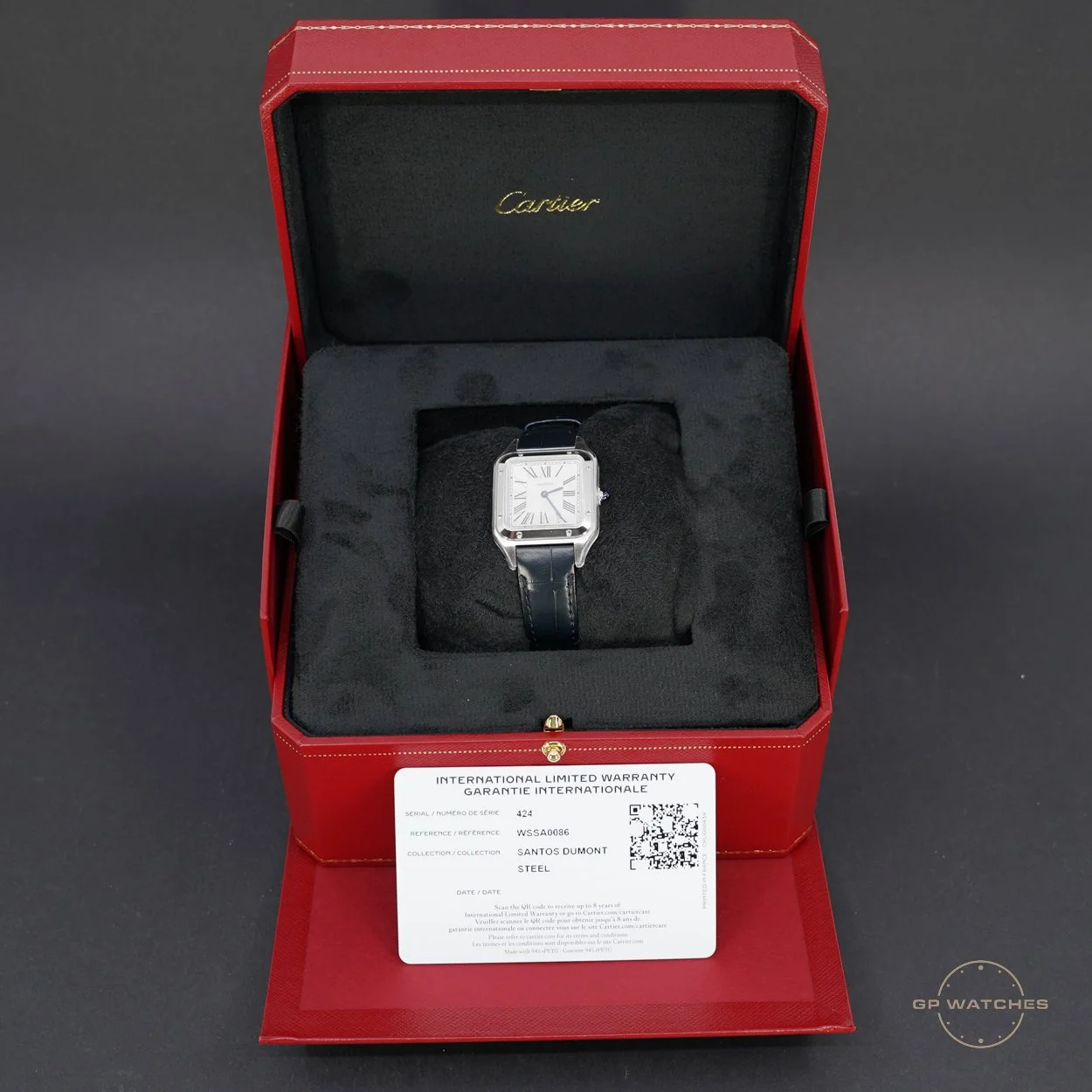 Her udbydes en fin Cartier Santos Dumont, reference WSSA0086 – en moderne fortolkning af et ægte designikon. Modellen kommer i stål med den elegante sølv skive, klassiske romertal og blå visere.