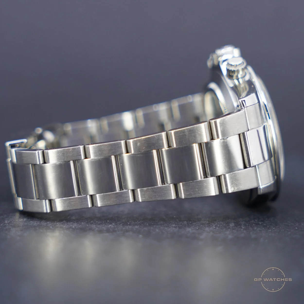 Rolex Daytona 116520 – den legendariske kronograf i stål. Dette eksemplar er fra 2012 og har den eftertragtede sorte skive. Uret fremstår i pæn stand med normale brugsspor efter alder. Bemærk det er den nyere udgave med det nye spænde. Perfekt til samleren eller som en robust sportsmodel til dagligt brug. Der laves faktura på købet og der gives 2 års garanti. Uret kommer med boks og papirer.