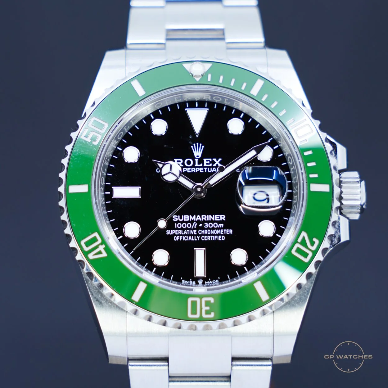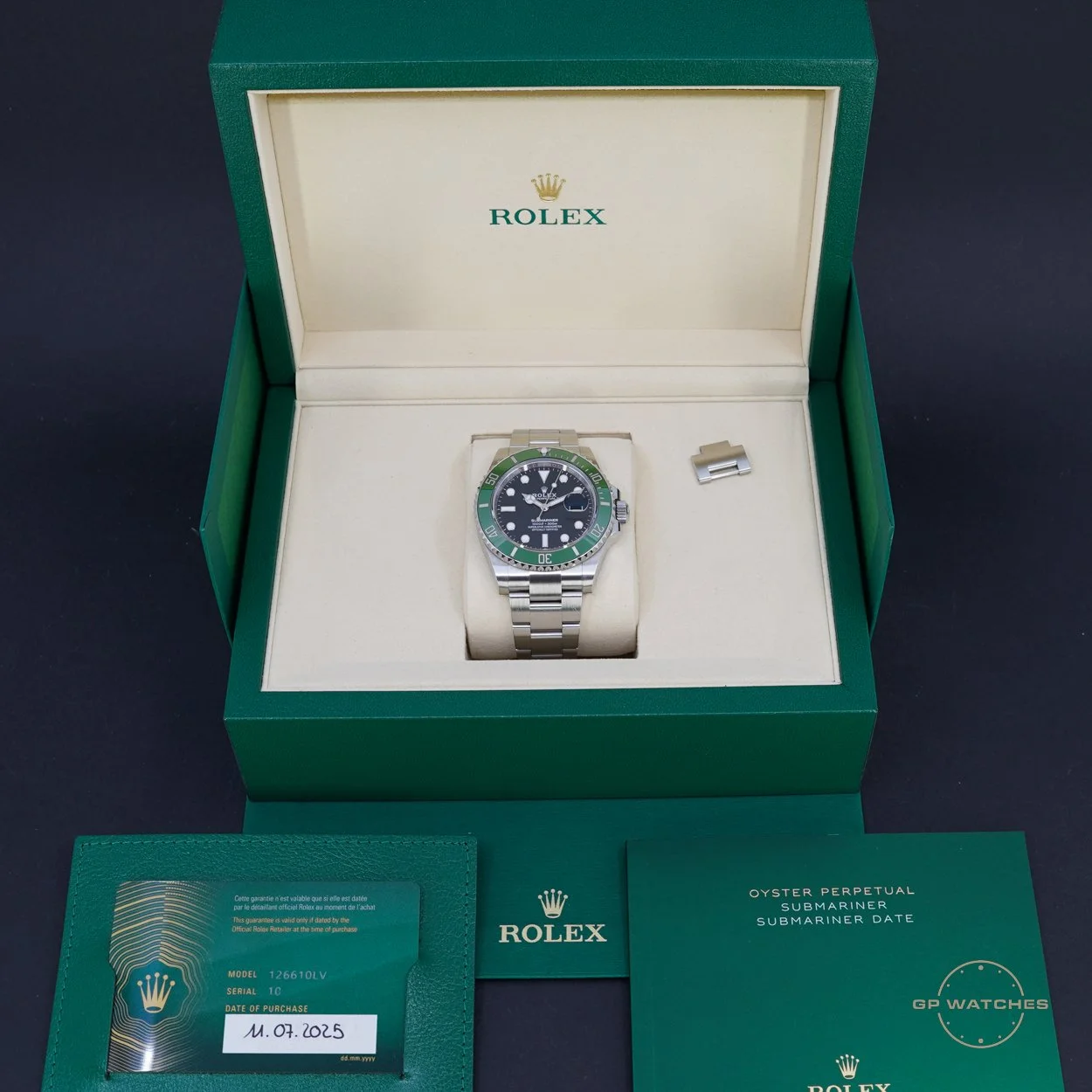 Rolex Submariner 126610LV Starbucks med bokse og papirer fra midt 2025. Uret fremstår i fin stand med lidt små hairlines og ridser. Den aktuelle LV-model af submariner i 41 mm. Her i den netop opdaterede udgave med den nye MK2 lynette, som er mere gullig grøn end foregængeren. Denne variant blev introduceret i foråret som en hyldest til Submarinerens 70 års jubilæum.