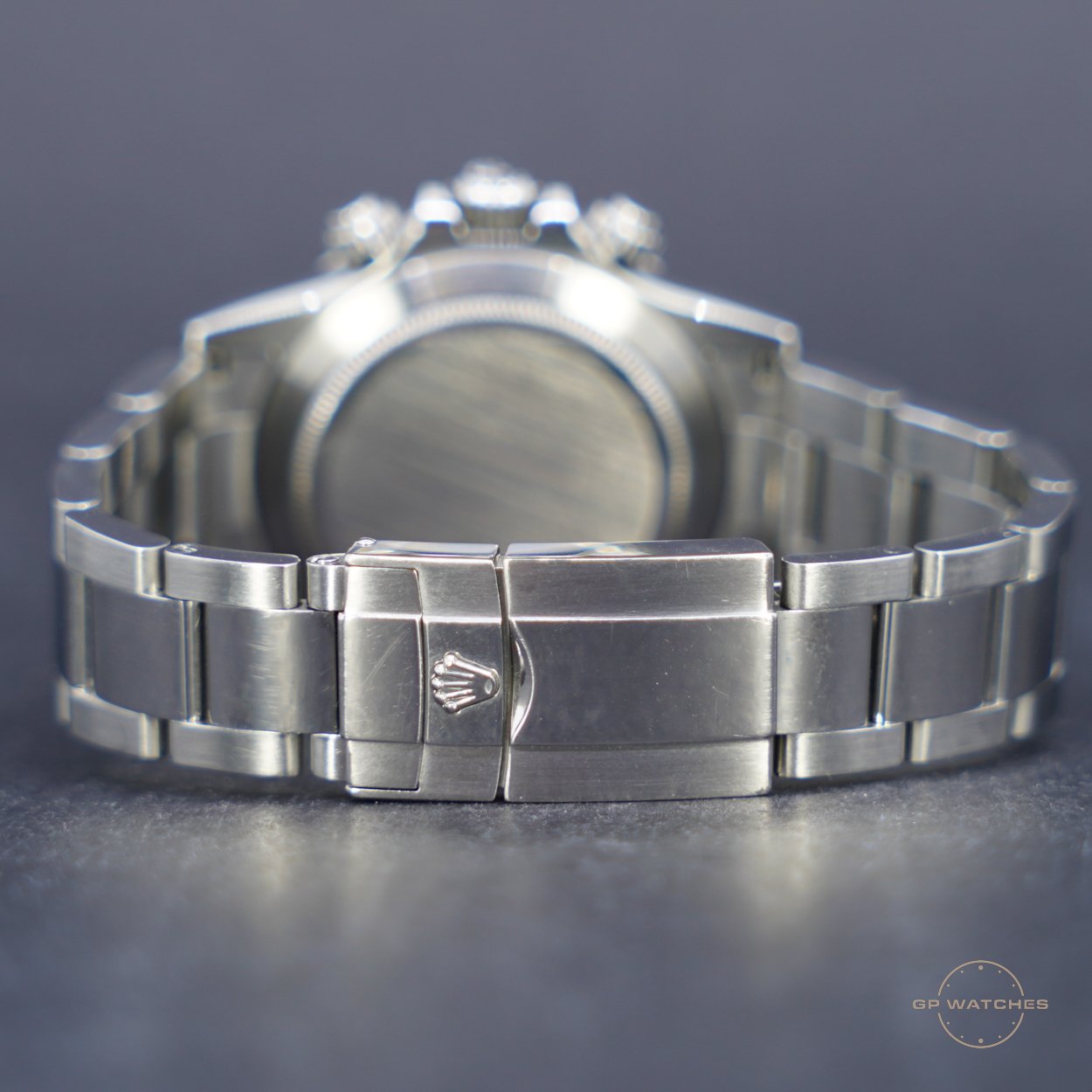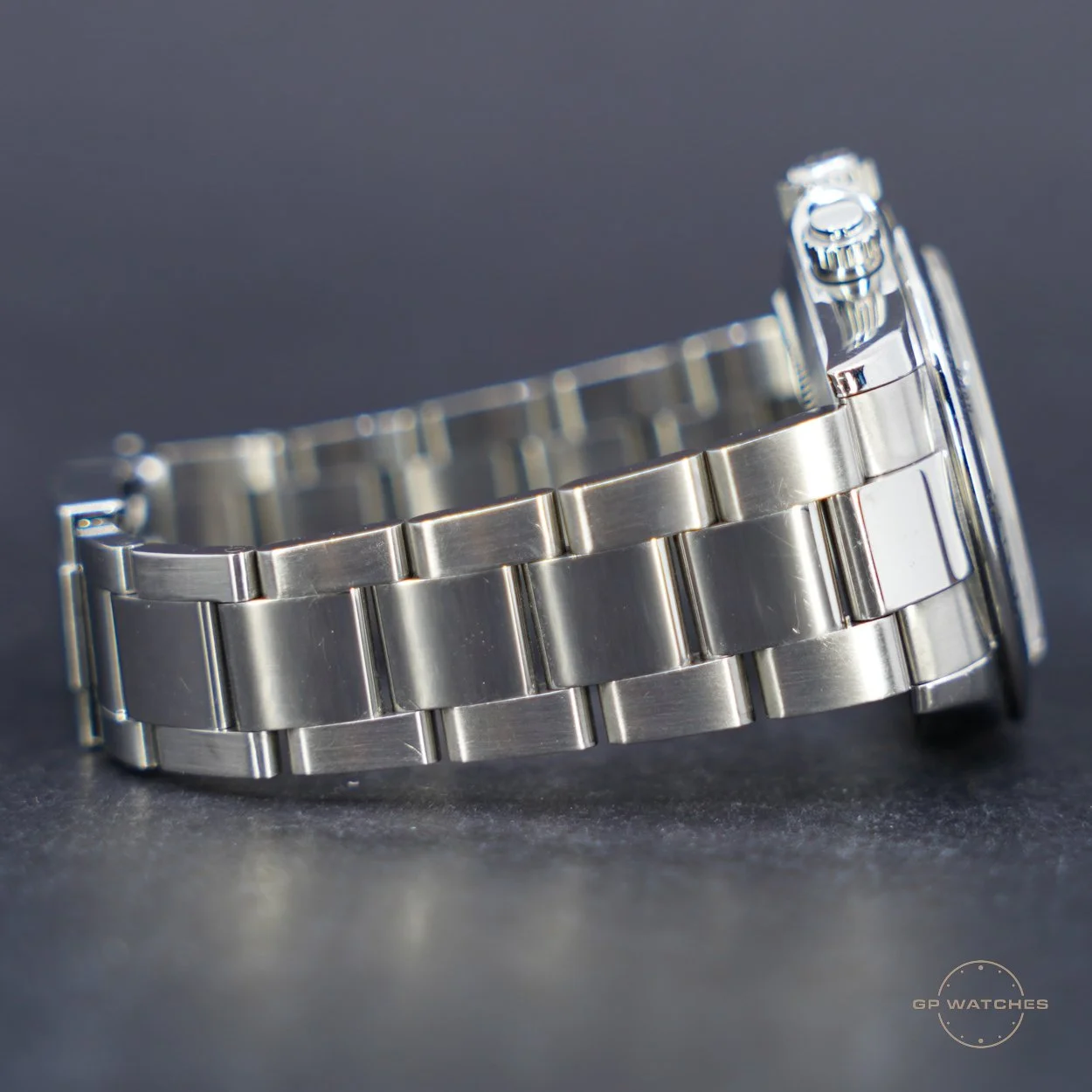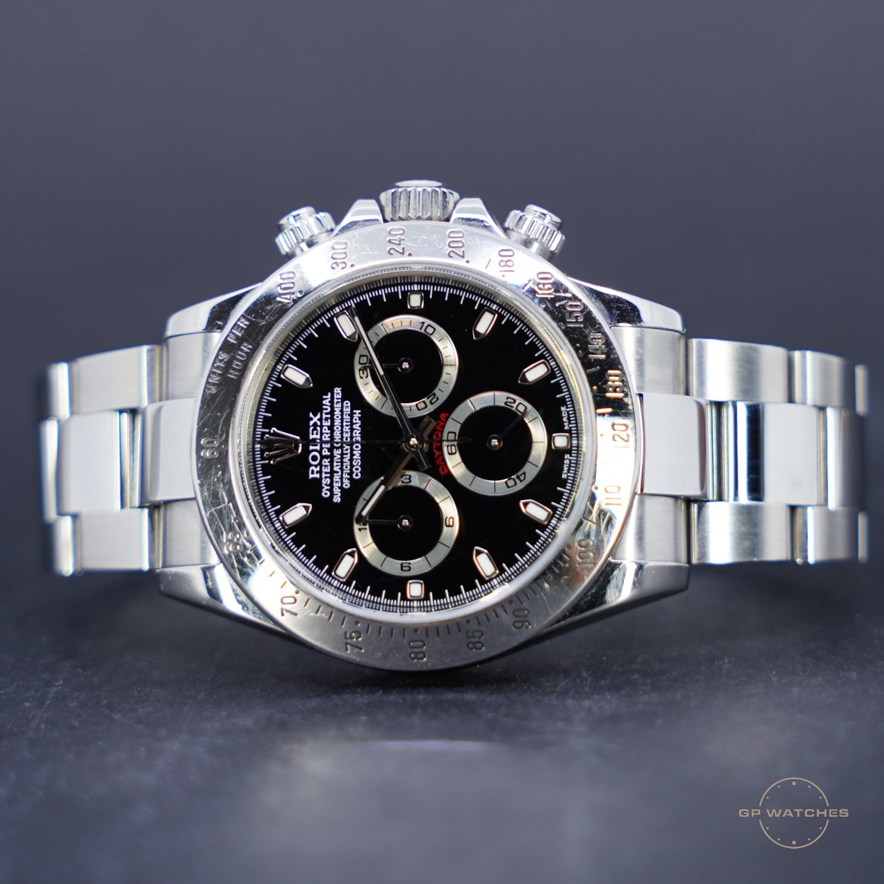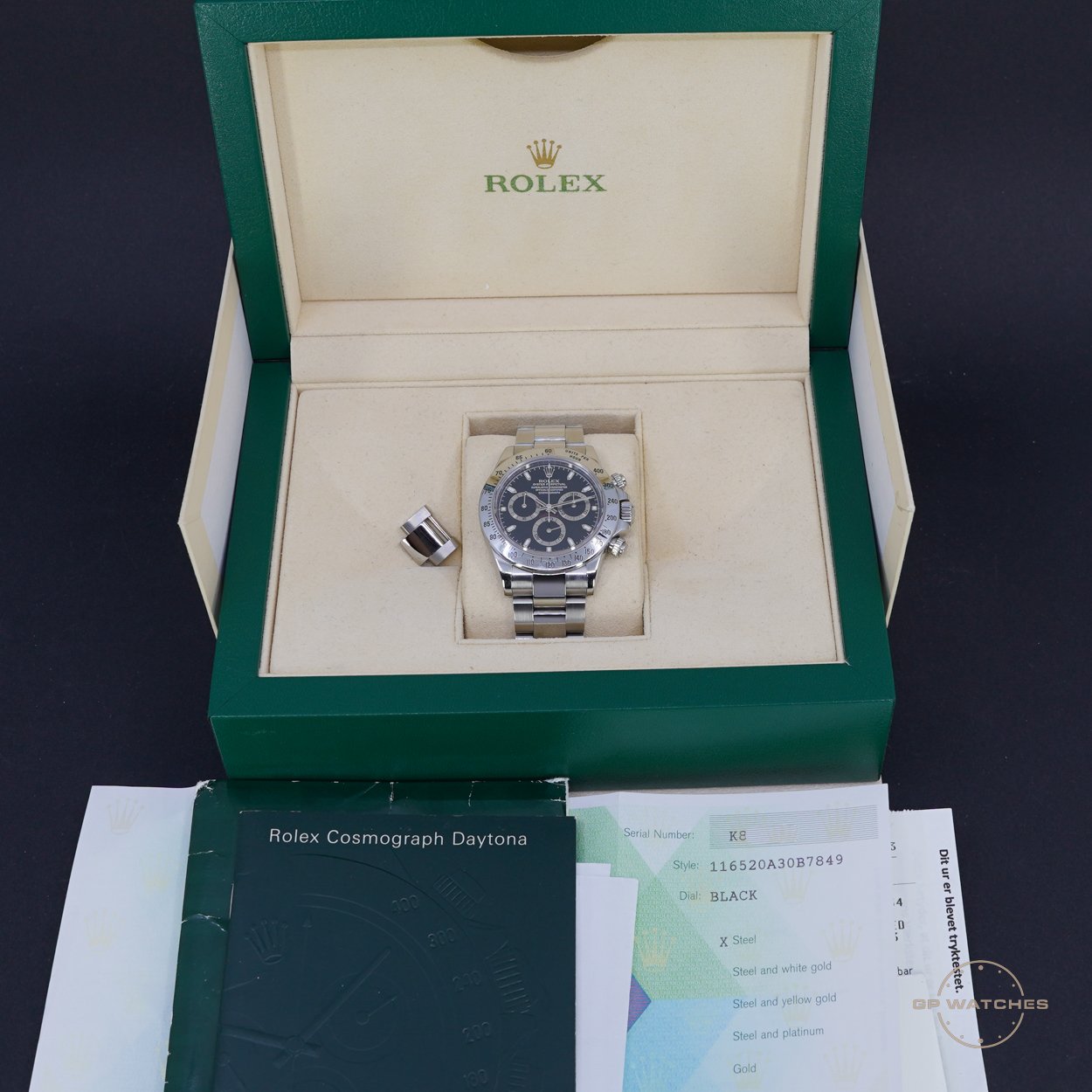 Rolex Daytona 116520 – den legendariske kronograf i stål. Dette eksemplar er fra 2002 og derfor en af de første udgaver og har den eftertragtede sorte skive. Uret fremstår i pæn stand med normale brugsspor efter alder. Bemærk det er den tidlige udgave med slim hands. Perfekt til samleren eller som en robust sportsmodel til dagligt brug. Der laves faktura på købet og der gives 2 års garanti. Uret kommer med boks og papirer.