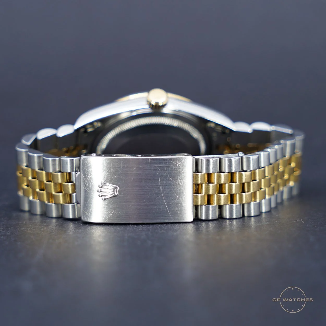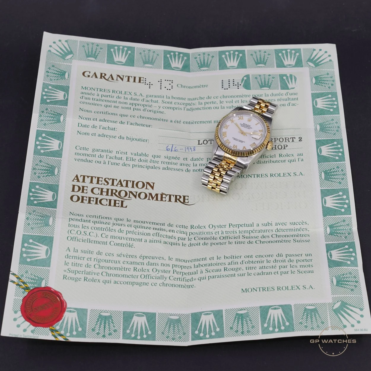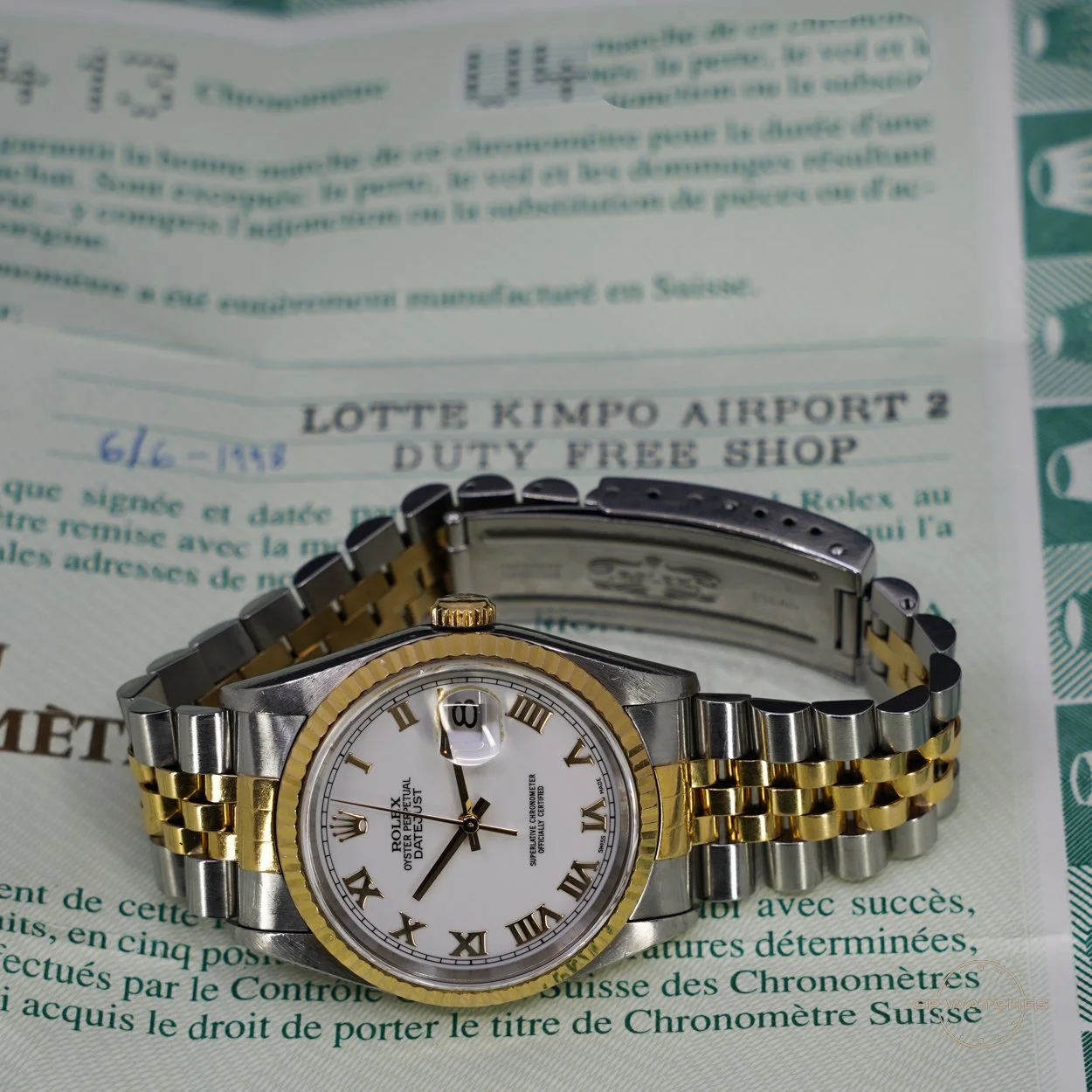 Rolex Datejust 16233 i 36 mm. En af de bedst sælgende datejust hos os. her i den helt rigtige udgave med den smukke hvide skive med romertal i guld. Uret er i fair stand ift. årgang og kommer med papirer fra 1998. Boks kan tilkøbes for 2000 kr.
