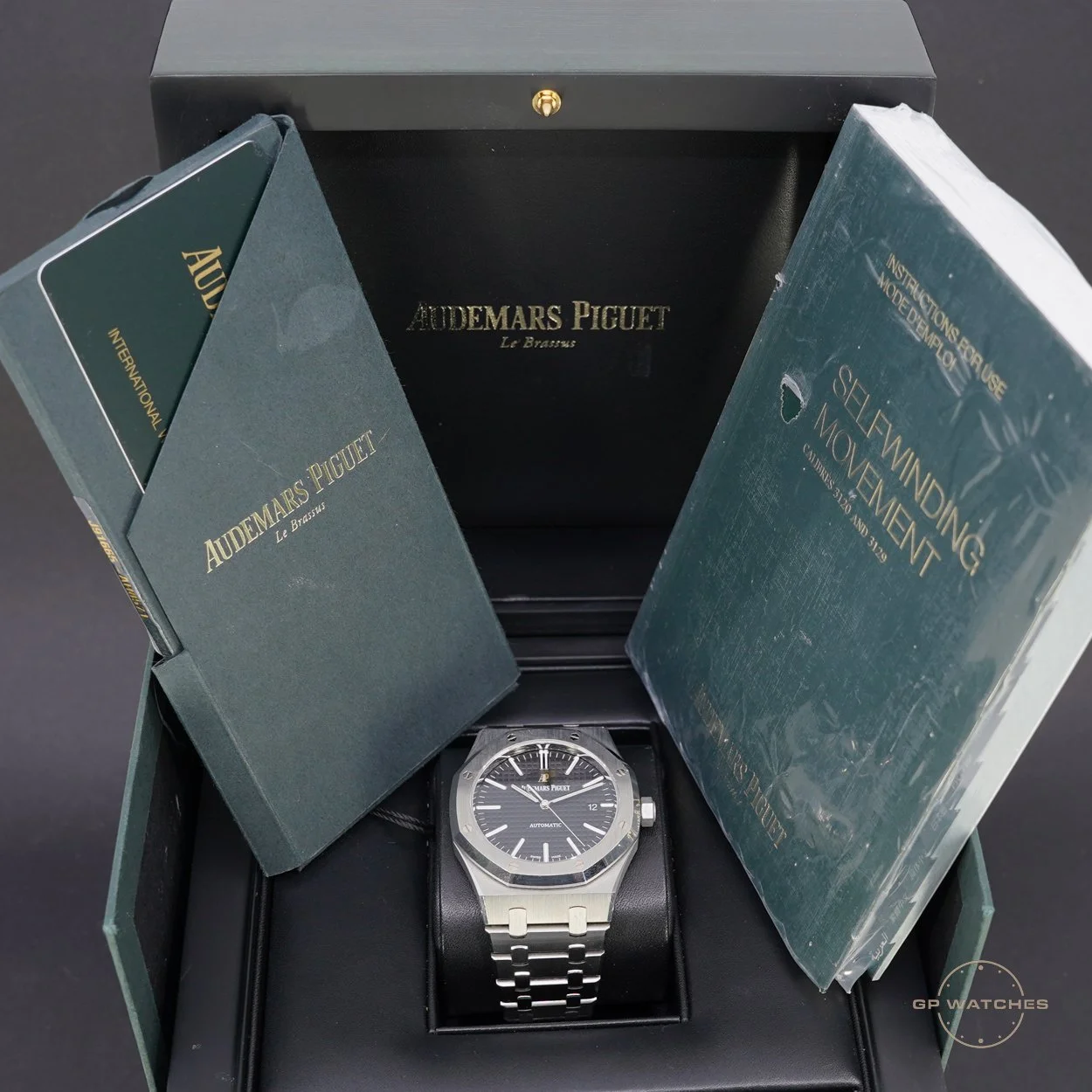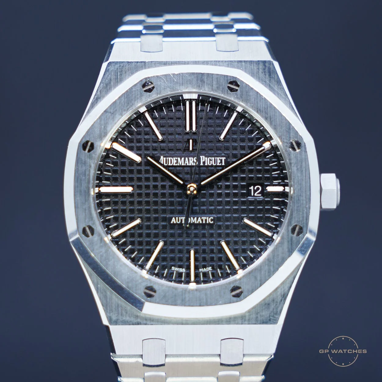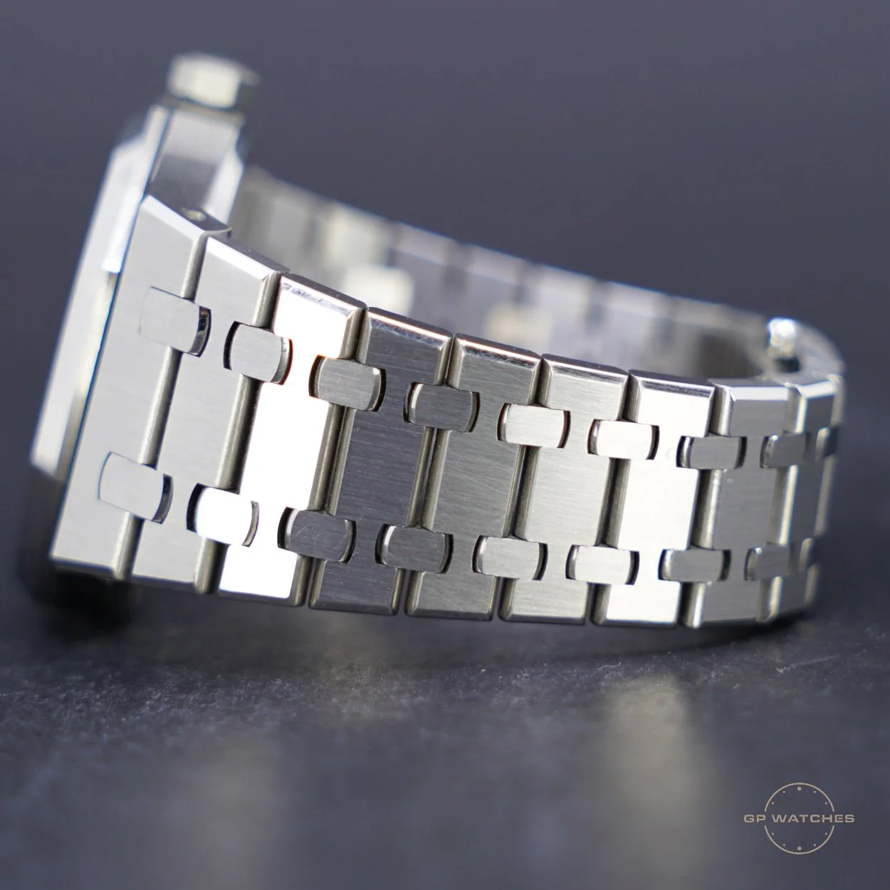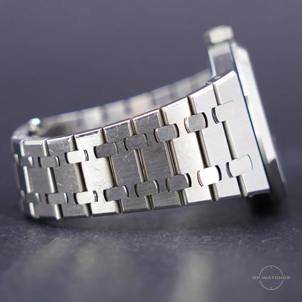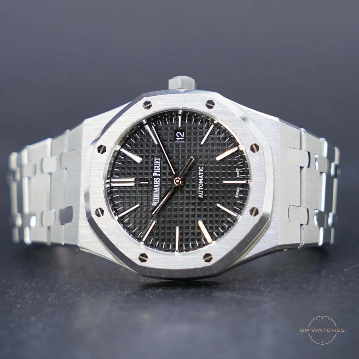 Audemars Piguet Royal Oak. Den nu udgåede reference 15400ST kan vi tilbyde her med den eftertragtede sorte skive. Uret fremstår i god stand og kommer med boks og papirer fra 2018. Svinger fint og holder tiden fint. Trænger ikke til service.