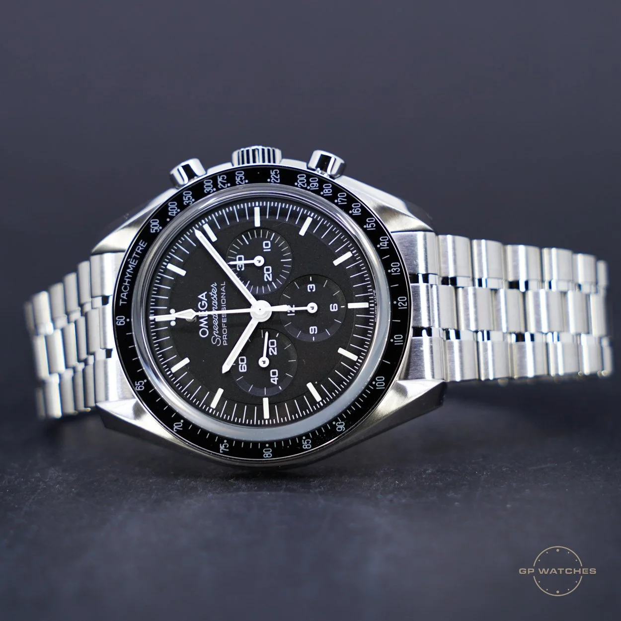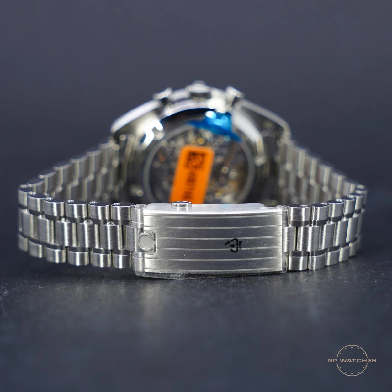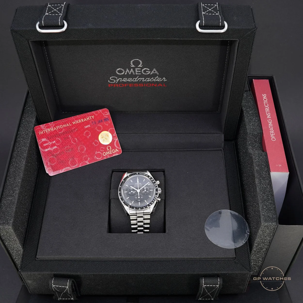 Omega Speedmaster Professional 42 mm. Den nye udgave af Omega Speedmaster med den smallere lænke og opdaterede spænde med glidelock. Kommer som et fuldt sæt med boks og papirer. Uret fremstår helt nyt og absolut ubrugt og stadig med stickers hist og her. Dette er 002-modellen med safirglas og glas bagkasse