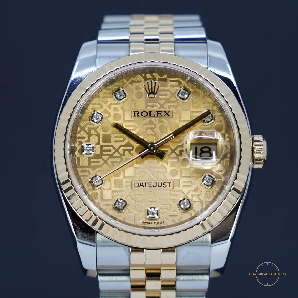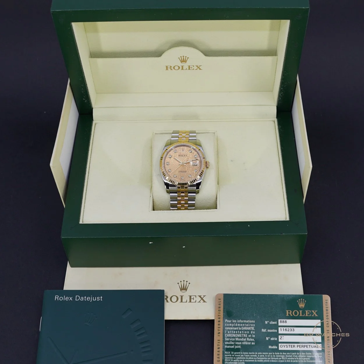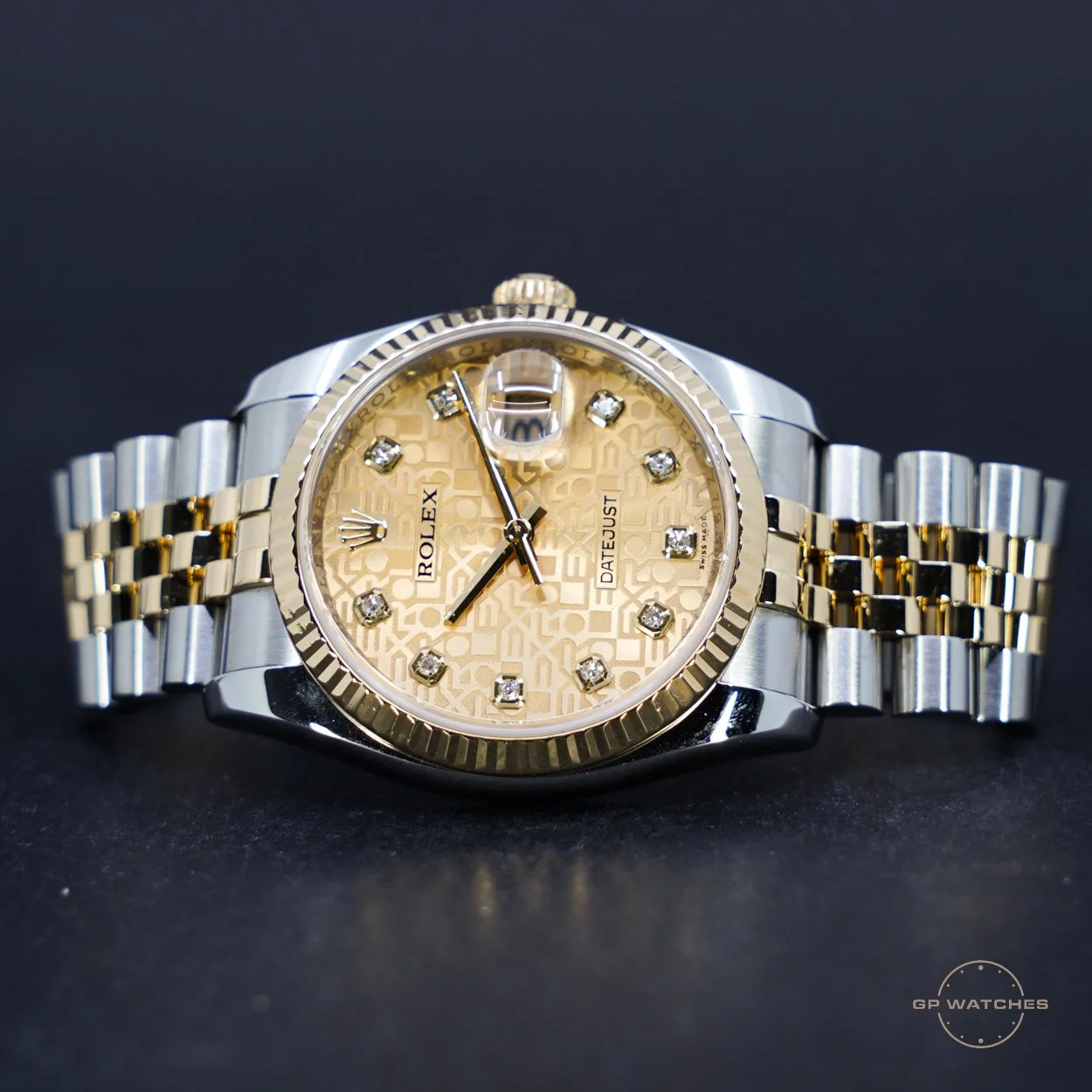 Rolex Datejust 116233. Det populære datejust i guldstål 36 mm med den skjulte lås. Denne model er med den smukke (computer dial) champagneskive med diamanter. Uret fremstår i flot stand og kommer med boks og certifikat fra 2007.