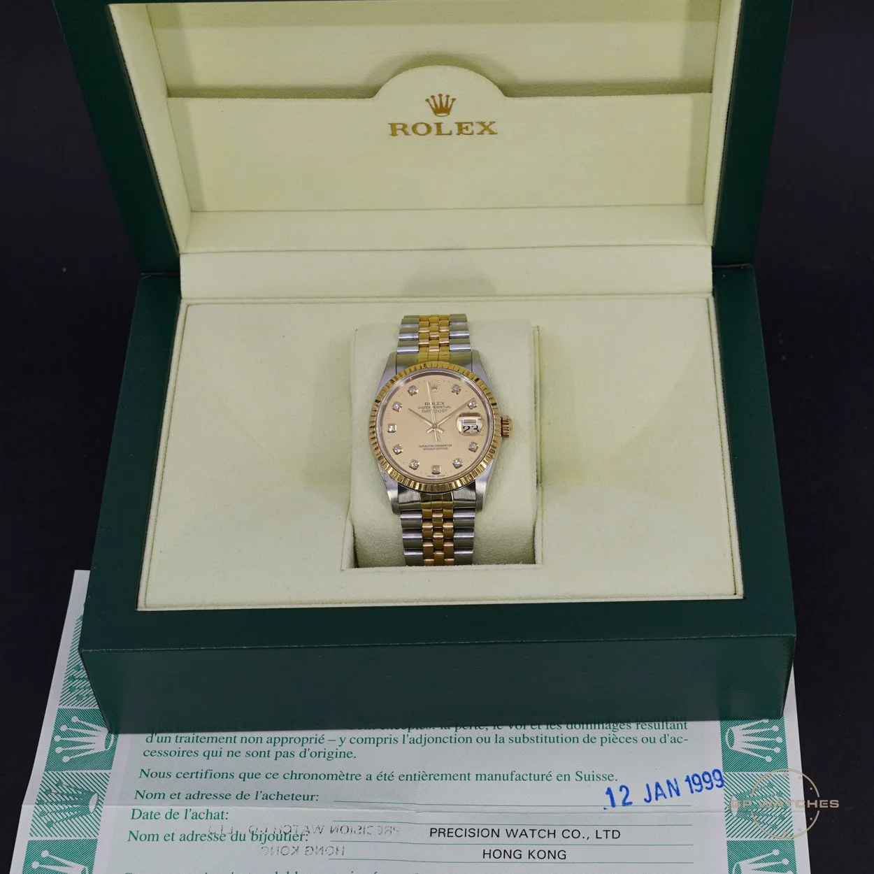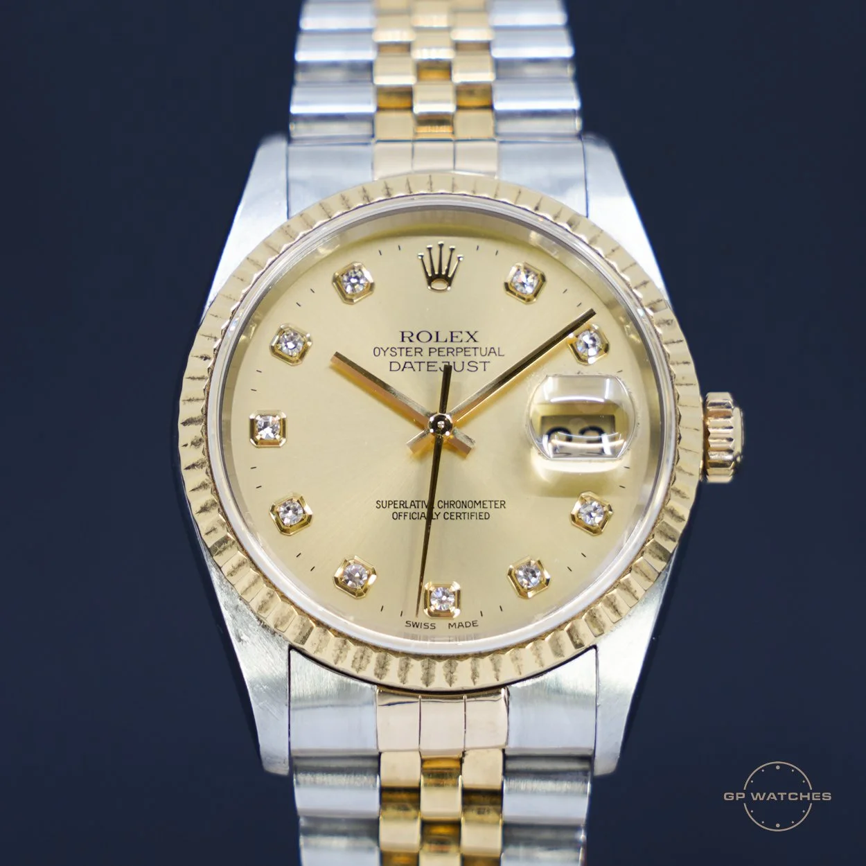 Rolex Datejust 16233 i 36 mm. En af de bedst sælgende datejust hos os. her i den helt rigtige udgave med den nye smukke champagneskive med store diamanter. Uret er i god stand og kommer med nyere boks og certifikat fra 1999.