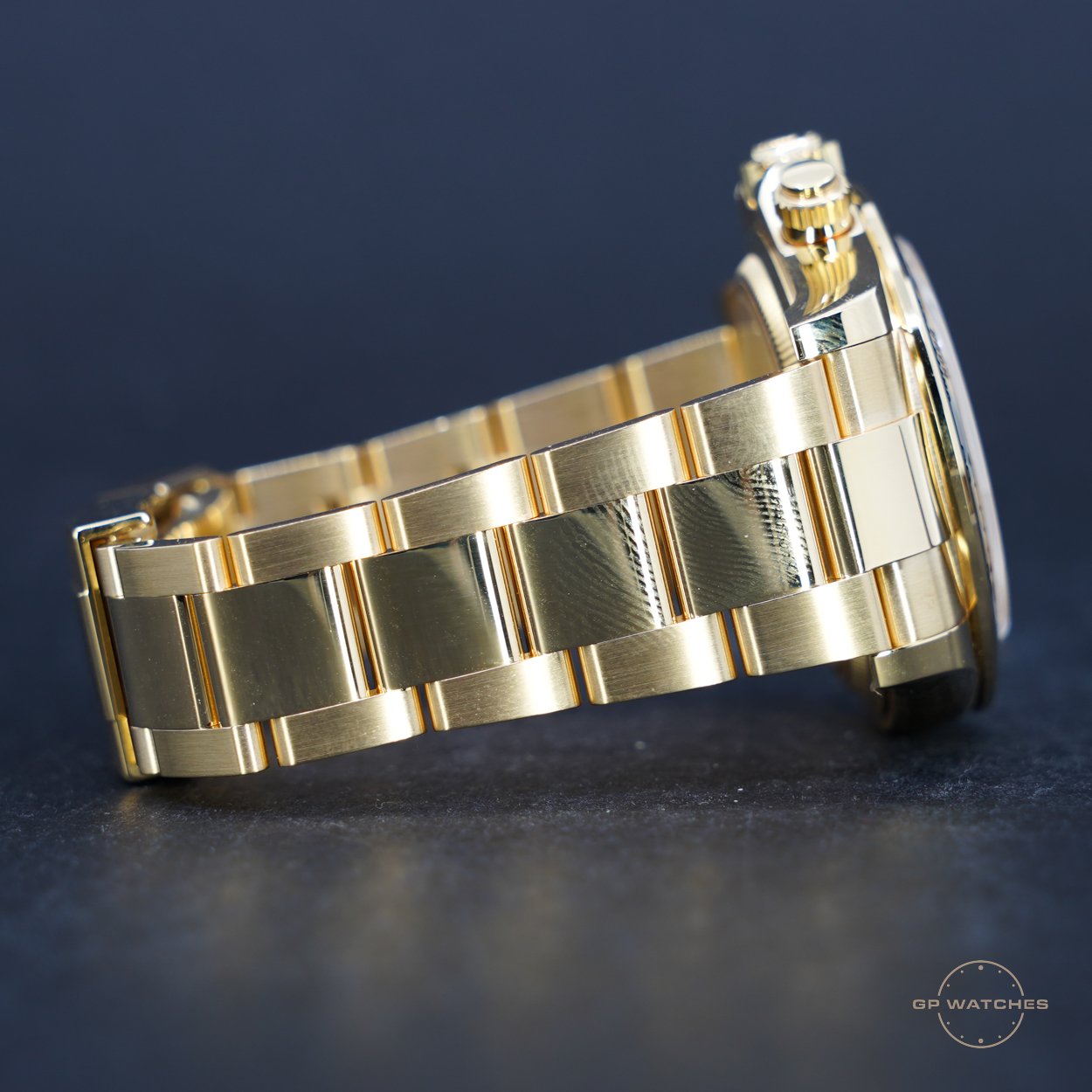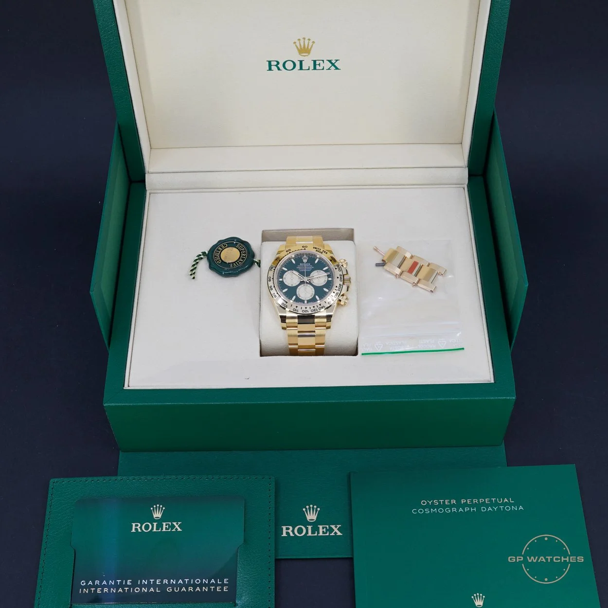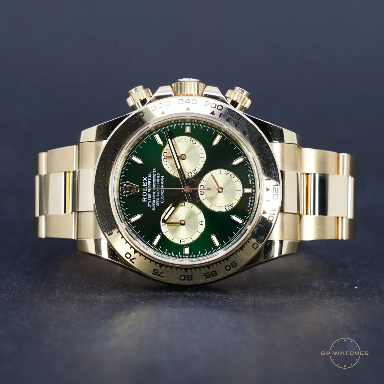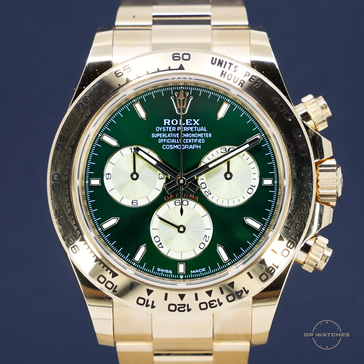 Rolex Daytona 126508 “John Mayer” i 18 kt. gult guld. En af de mest ikoniske og eftertragtede moderne Daytona-modeller, kendt for sin smukke grønne sunburst-skive kombineret med den massive guldkasse og Oyster-lænke.