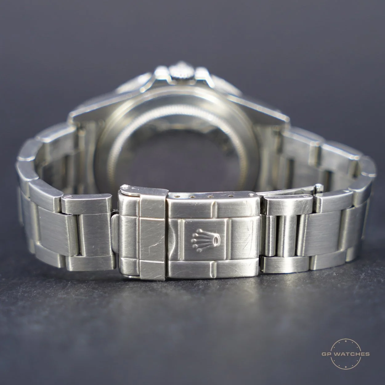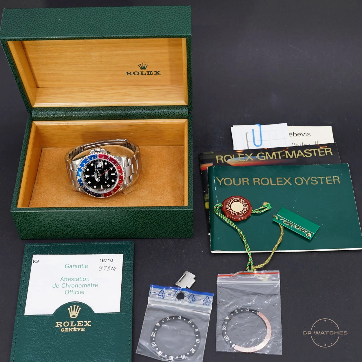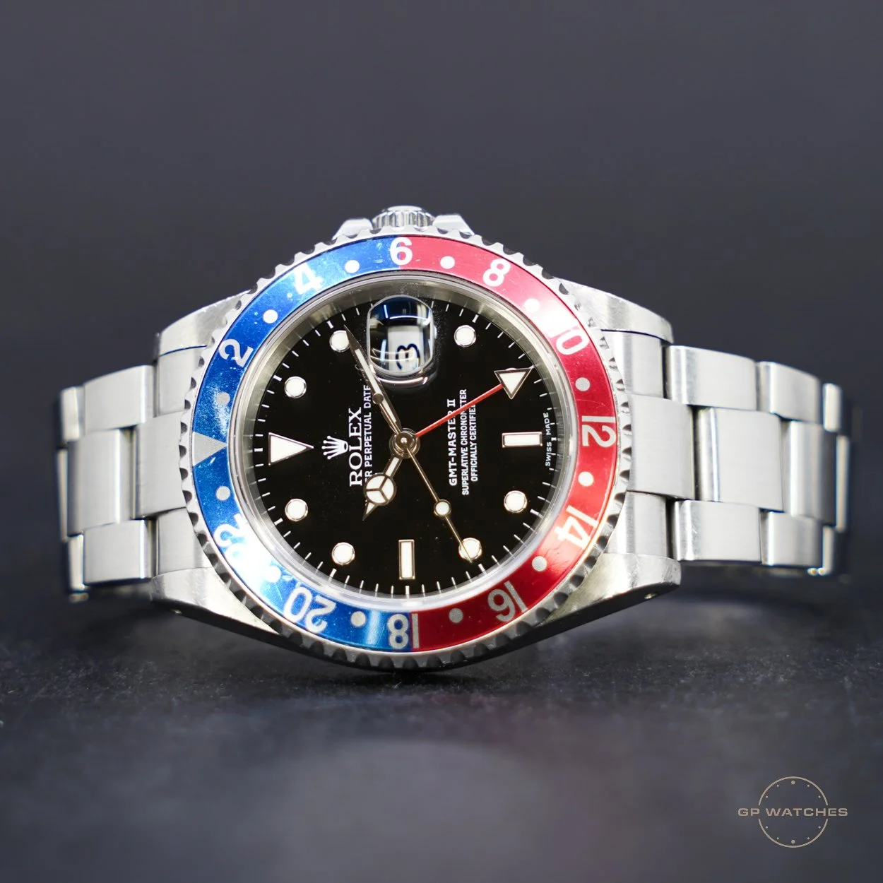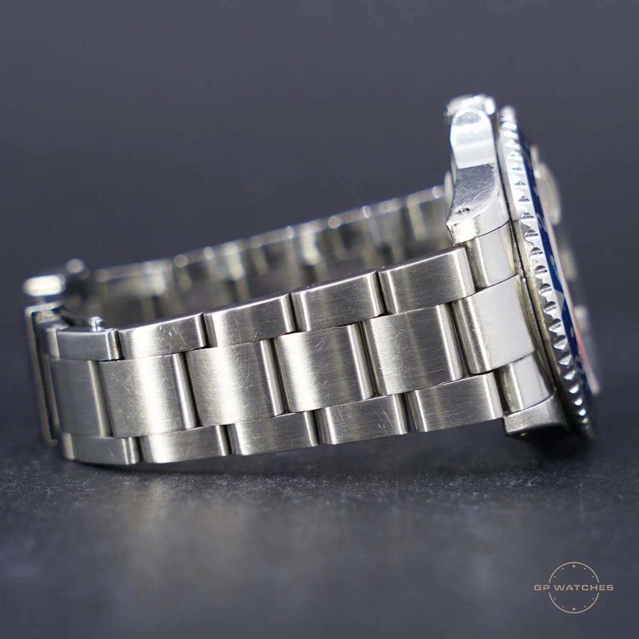 Rolex GMT-Master II 40 mm. Den klassiske og udgåede model af GMT-Master II “Pepsi”. Uret fremstår i flot stand og med minimalt stræk. En eftertragtet model med Solid endlinks og lugholes. Kommer på det originale pepsi insert med flot patinering, derudover medfølger der et flot patineret coke insert og et sort insert også. Kommer som et fuldt sæt fra Klarlund med alt tilnehør fra 2003.