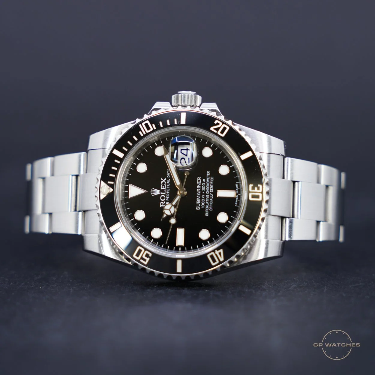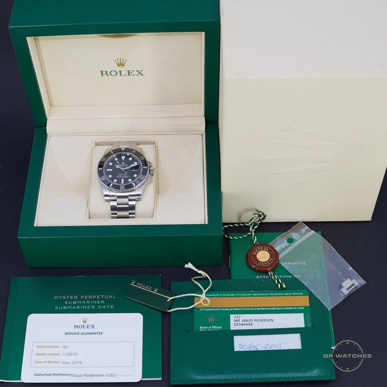 Rolex Submariner 116610LN. Den ældre reference med maxikasse i 40 mm, modsat den nyere reference 126610 som er 41 mm. Uret fremstår i god stand. Kommer med yderboks, inderboks, booklet og certifikat Dansk forhandler 2015. Derudover er uret serviceret samme sted i 2019. Uret svinger perfekt og går nemt 5-7 år endnu uden det trænger til service.
