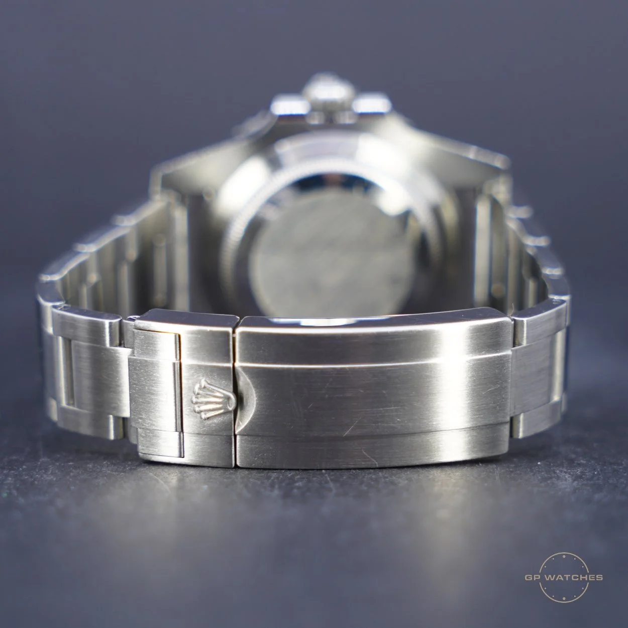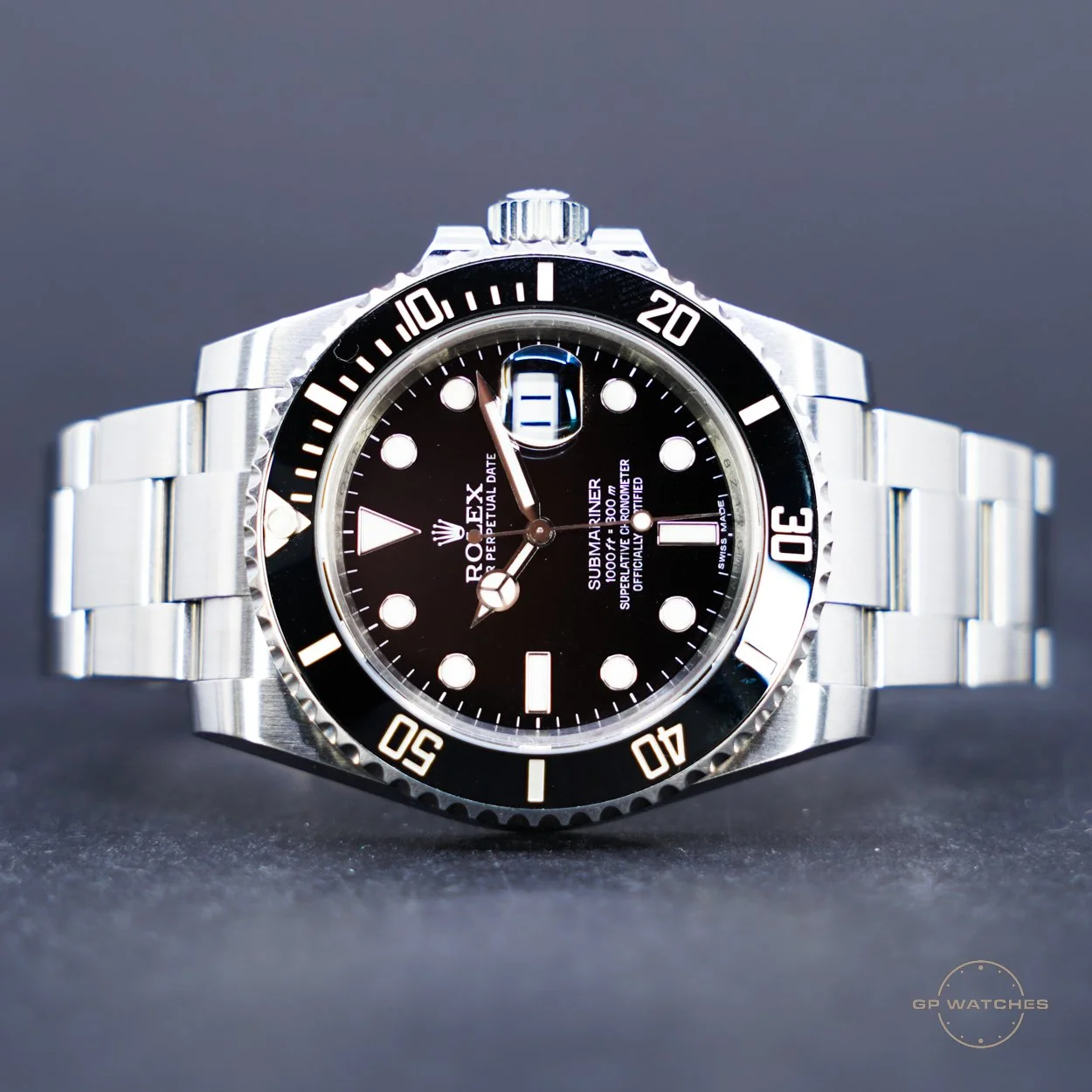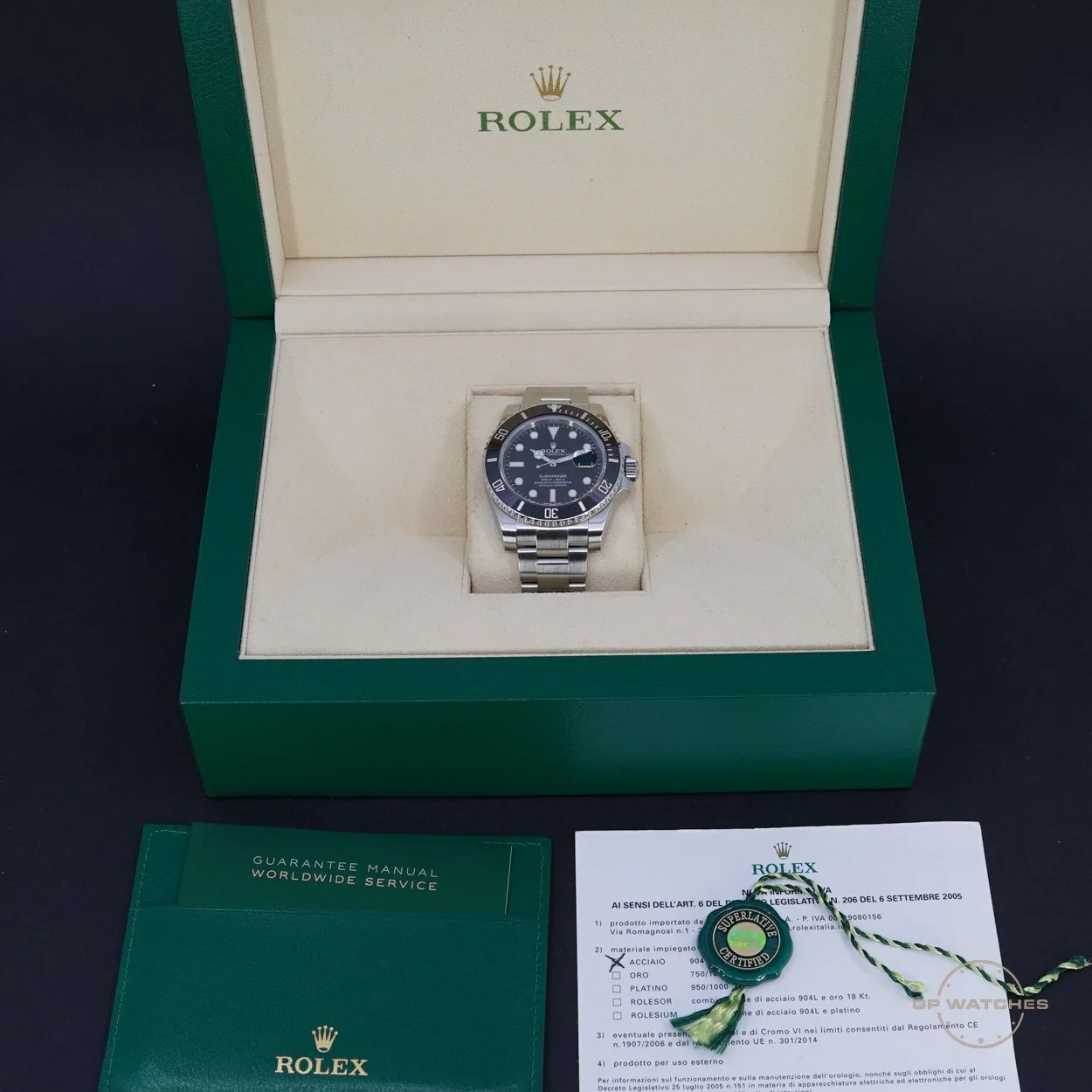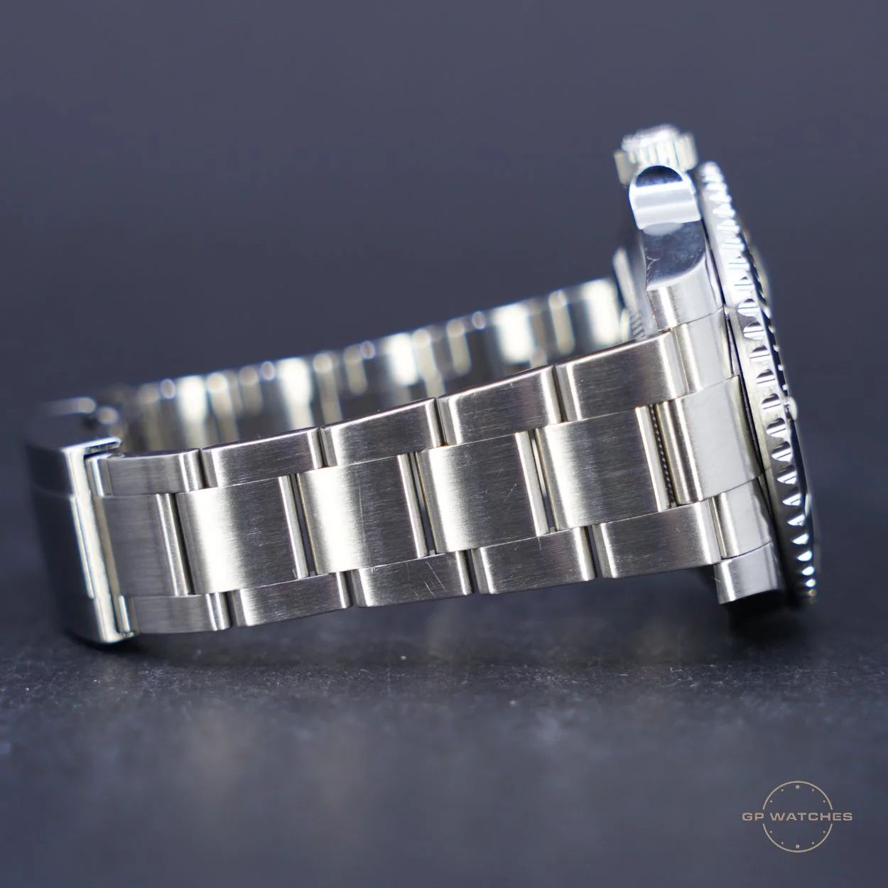 Rolex Submariner 116610LN. Den ældre reference med maxikasse i 40 mm, modsat den nyere reference 126610 som er 41 mm. Uret fremstår i god stand. Den absolut billigste på markedet. Dette skyldes primært at uret mangler certifikatet. Skiven er en af de første på modellen, men med blå lumen. så kan derfor dateres til 2013-2014. Kommer med 2 års garanti fra os.