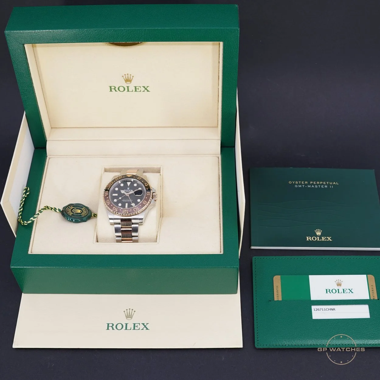 Rolex GMT-Master II 126711CHNR 2019. Den aktuelle udgave af den eftertragtede “Rootbeer” 40 mm Rosegold/stål i den aktuelle udgave. Fremstår i god stand med lidt hairlines. Kommer med yderboks, inderboks og certifikat fra 2019.